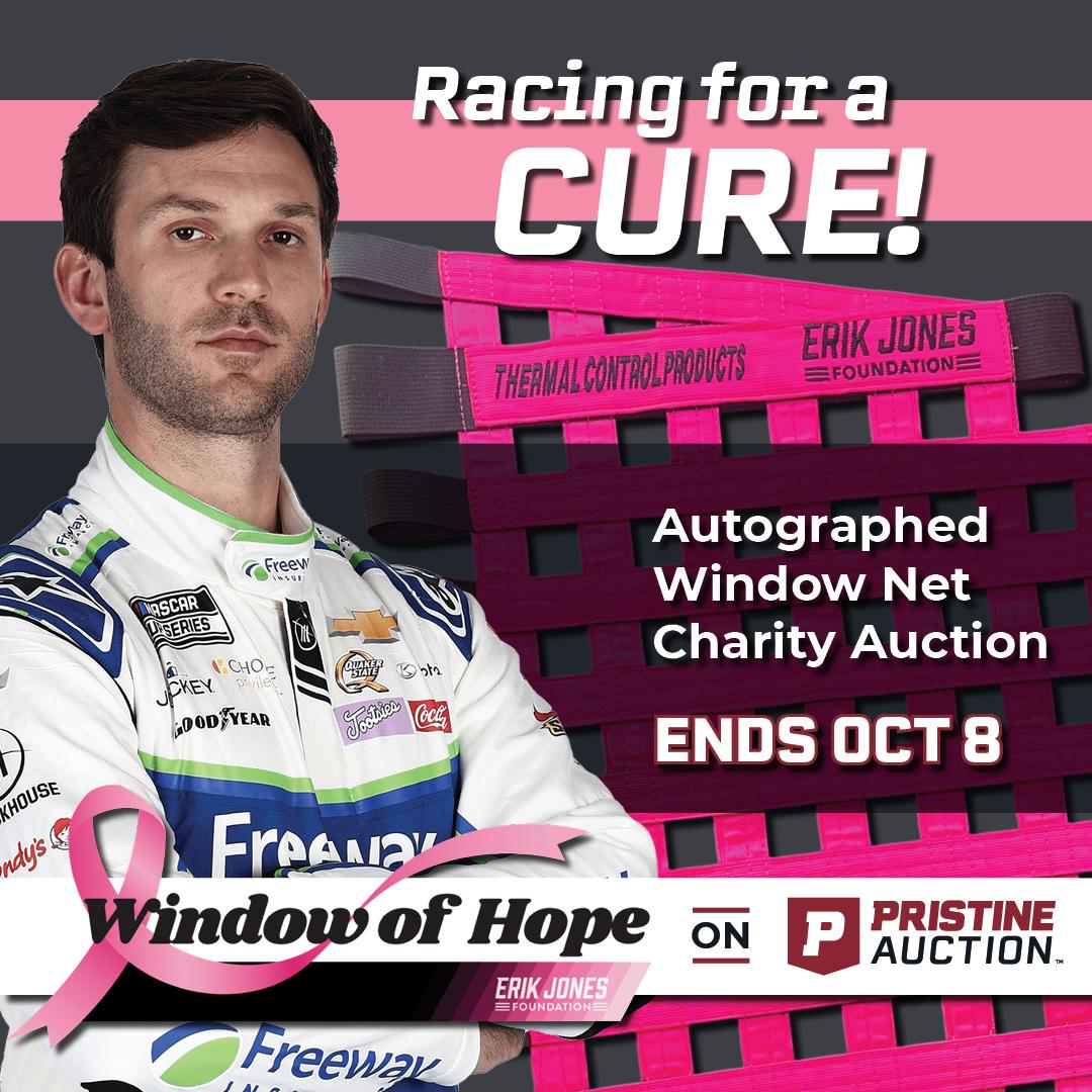 100% of the winning bid benefits the Erik Jones Foundation's Window of Hope program, which funds breast cancer detection and care across the country. The program has expanded each year with full NASCAR Cup Series participation and growing involvement from Xfinity and Truck teams.