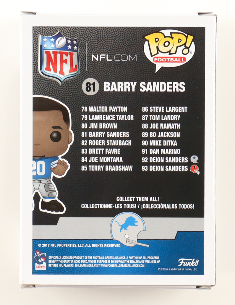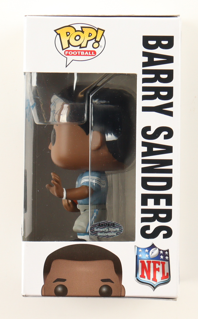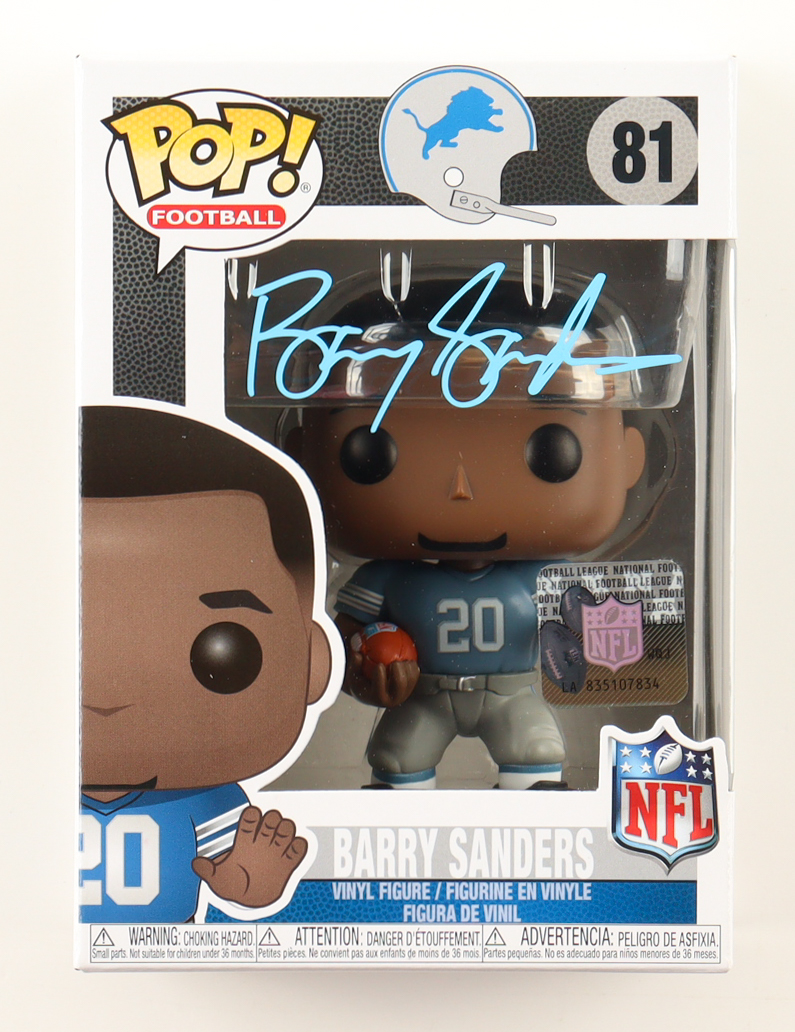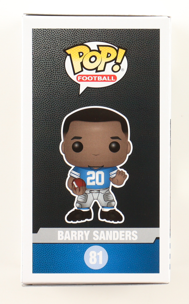 Funko Pop! vinyl figure measures 4" in height. Hand-signed on the packaging by Barry Sanders (Detroit Lions, HOF).