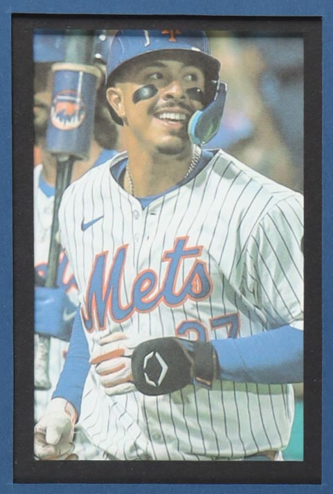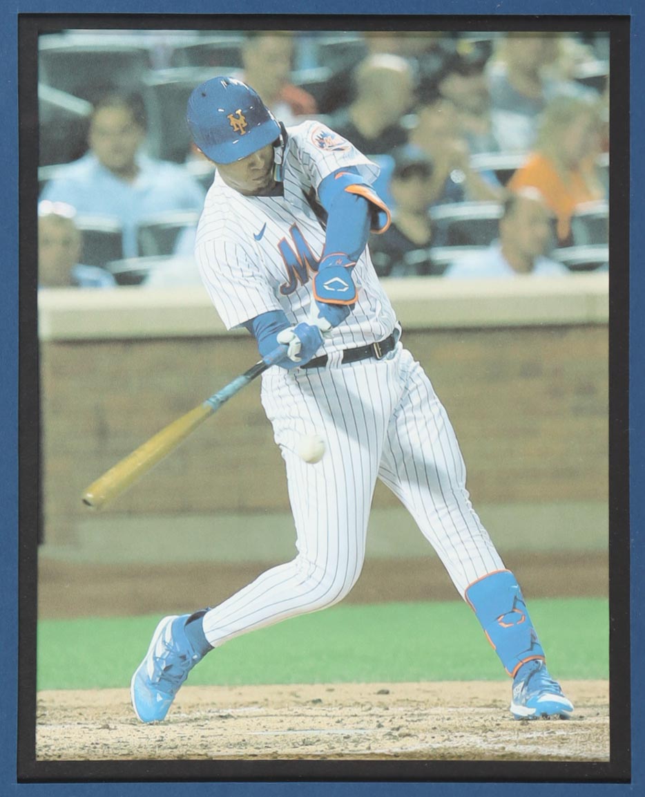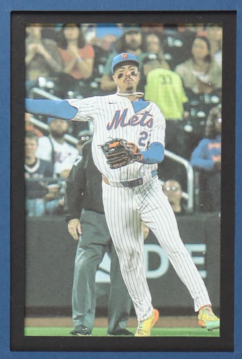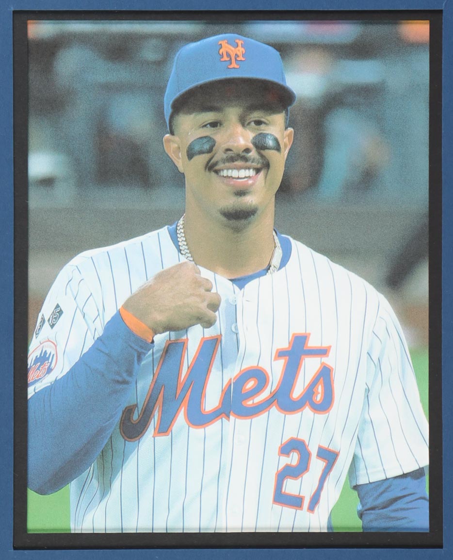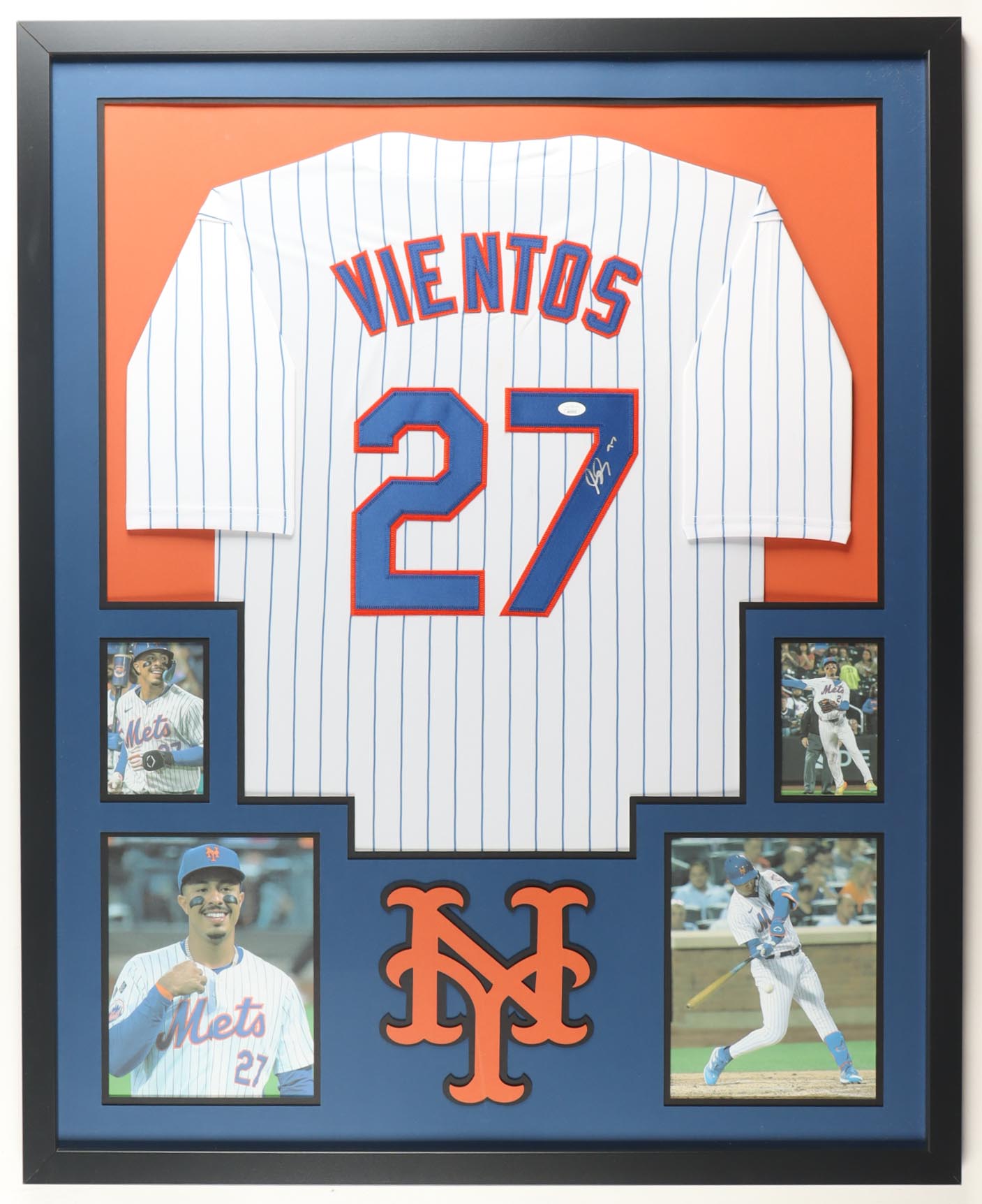 Custom frame measures 34" x 42" in size. Jersey has been hand-signed by Mark Vientos (New York Mets). Display also includes (4) unsigned photographs and a team logo patch.