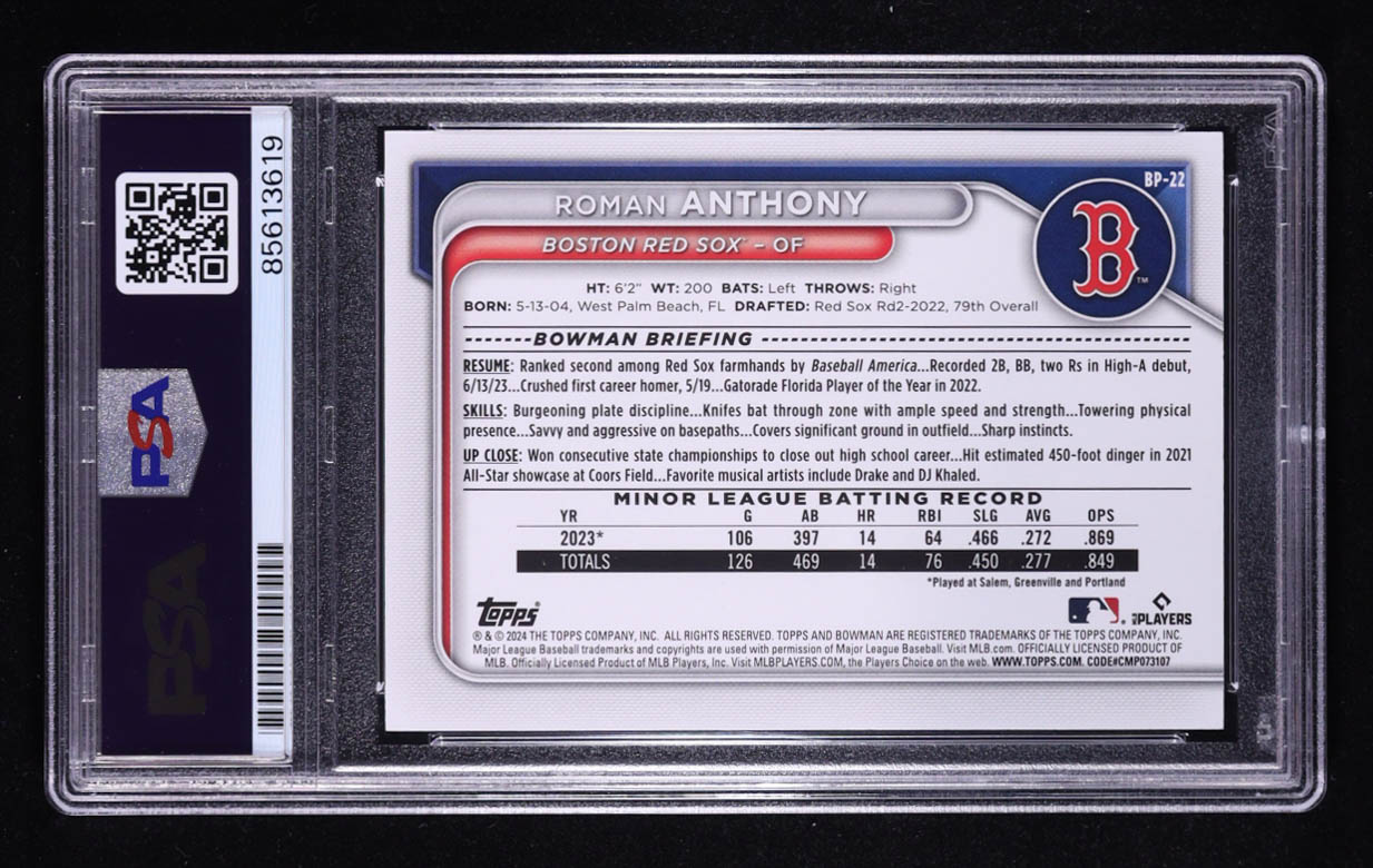 Roman Anthony Signed 2024 Bowman Prospects Neon Green #BP22 #311/399 RC (PSA Authentic | Auto 10)