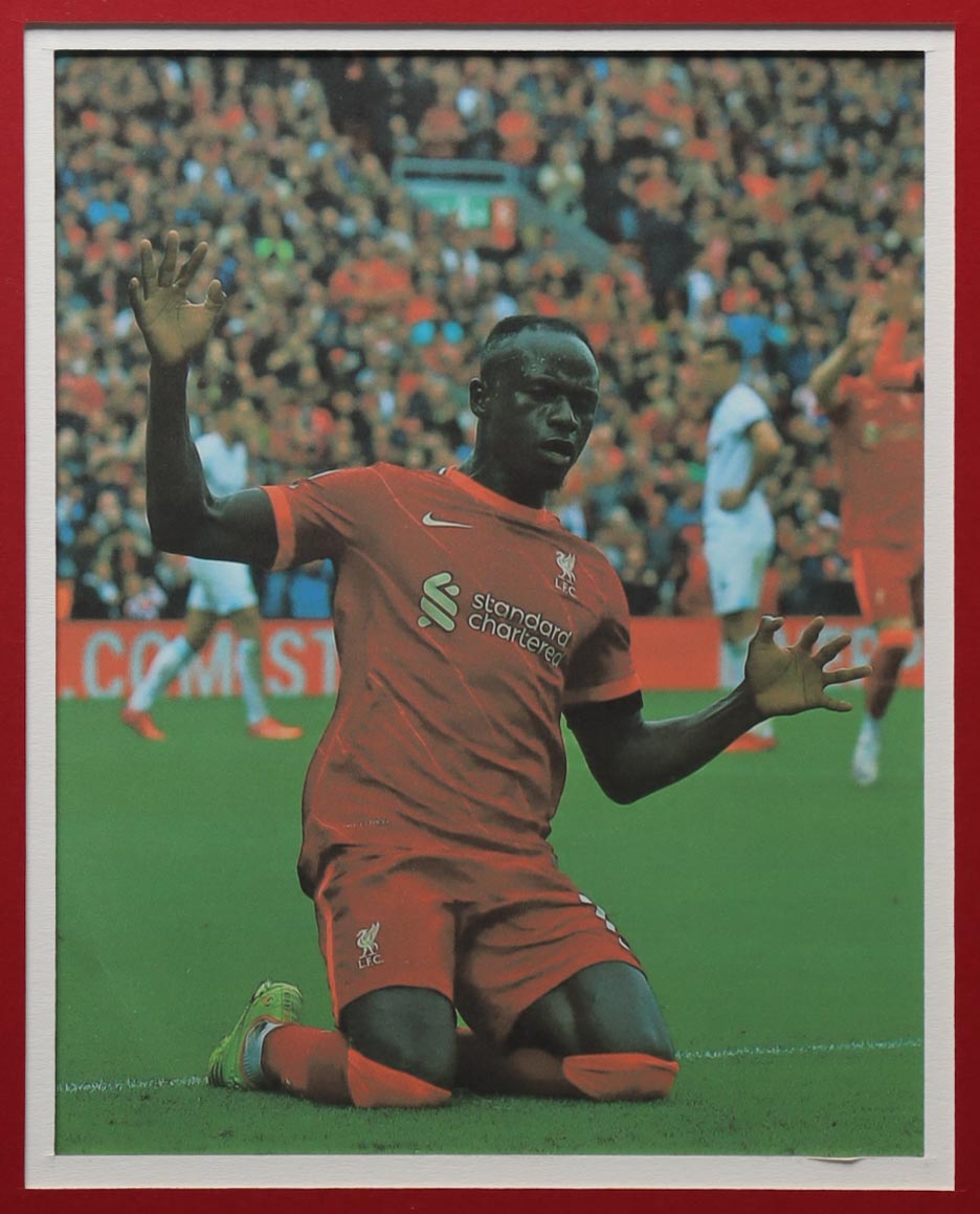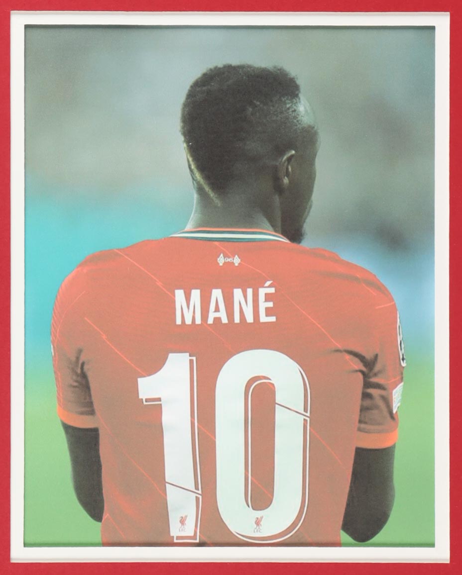 Custom frame measures 34" x 42" in size. Jersey has been hand-signed by Sadio Mane (Liverpool FC). Display also includes (4) unsigned photographs and a team logo patch.