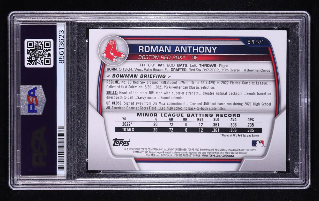 Roman Anthony Signed 2023 Bowman 1st Edition #BPPF71 RC (PSA Authentic | Auto 10)