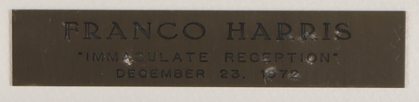 Custom frame measures 21.5" x 25.5" in size and features a photo that has been hand-signed by Franco Harris (Pittsburgh Steelers, HOF). Please note, frame borders have been scuffed and scrapped. Please see photos for more details.