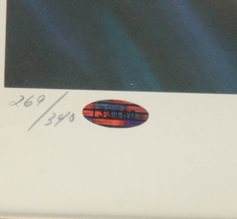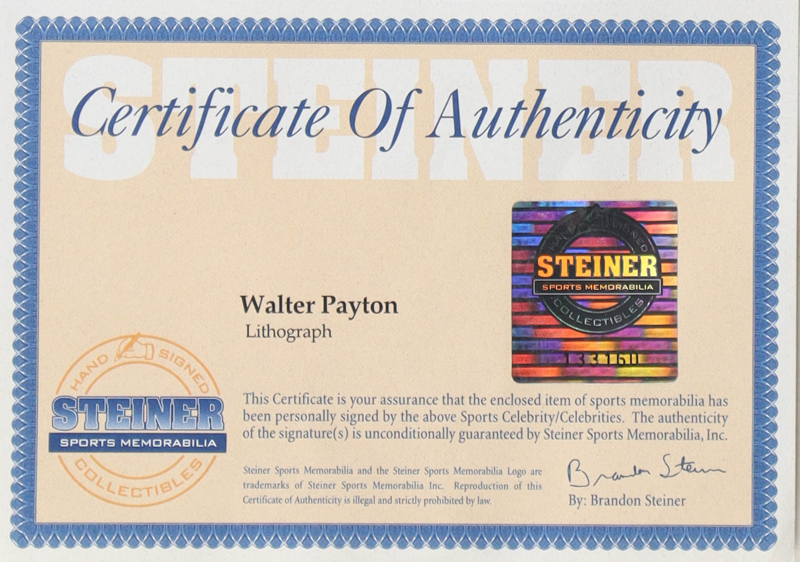 Custom frame measures 20.5" x 29.5" in size and features a Limited Edition #269/340 lithograph that has been hand-signed by Walter Payton (D.1999, Chicago Bears, HOF). Please see photos for more details.