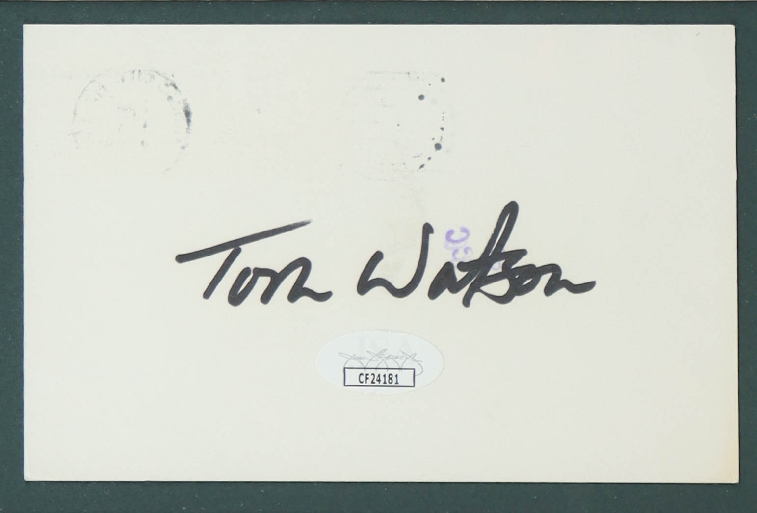 Custom frame measures 16" x 20" in size. Index card is hand-signed by Tom Watson. Display also includes an unsigned 8" x 10" photograph.