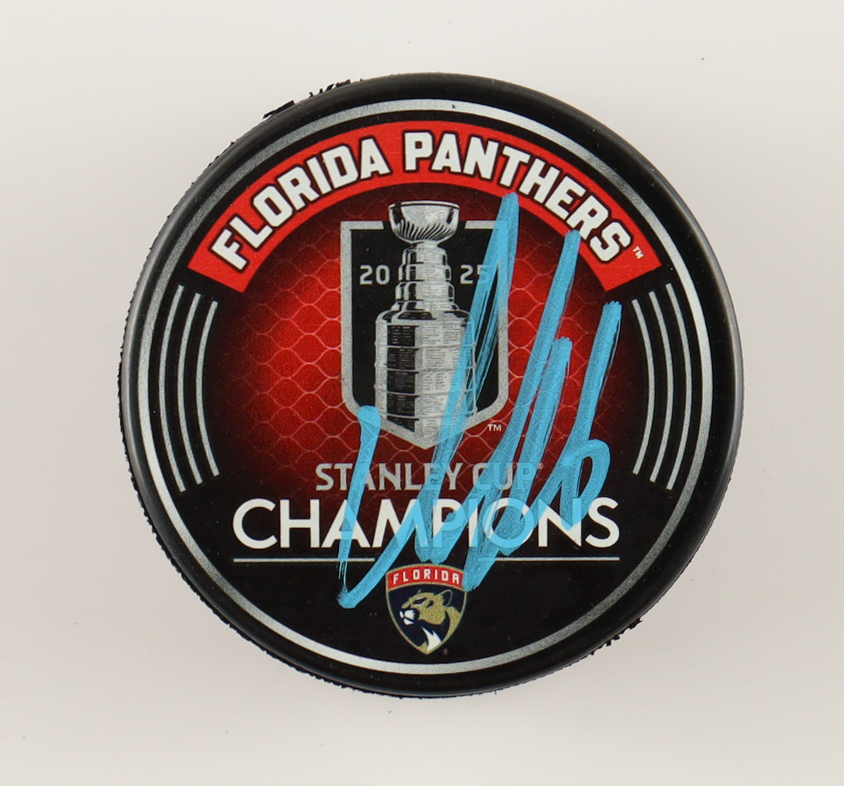 Florida Panthers 2025 Stanley Cup Champions Logo Hockey Puck. Hand-signed by Aleksander Barkov.