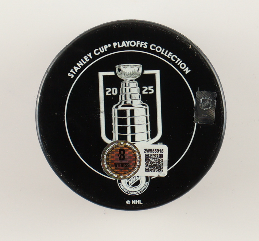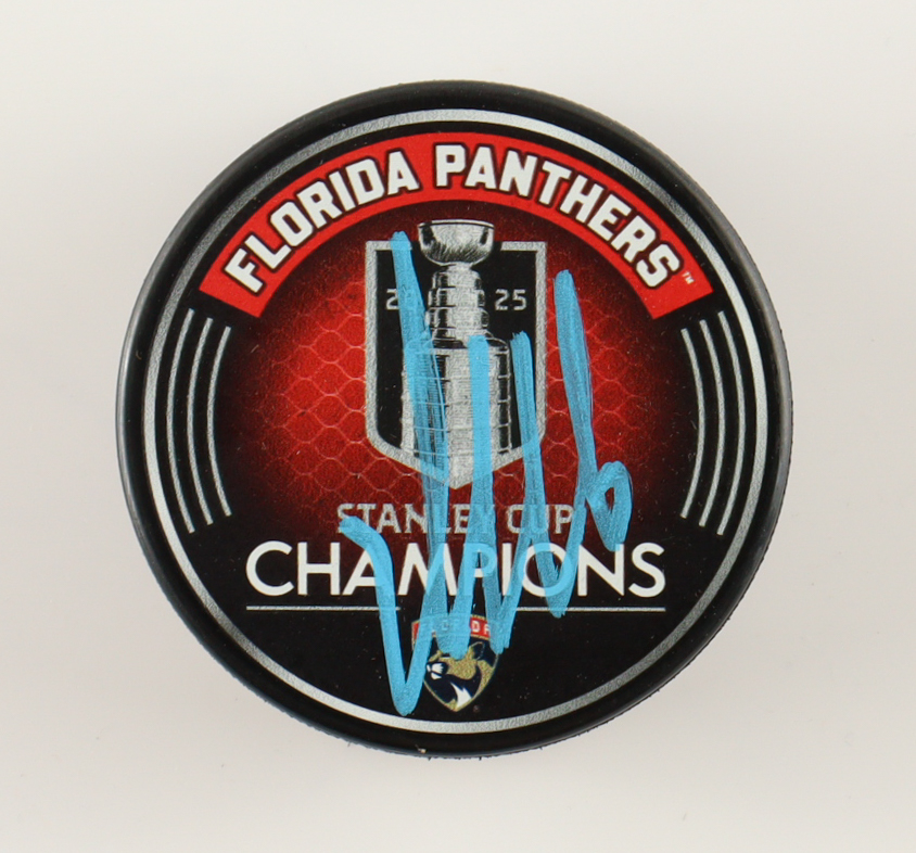 Florida Panthers 2025 Stanley Cup Champions Logo Hockey Puck. Hand-signed by Aleksander Barkov.