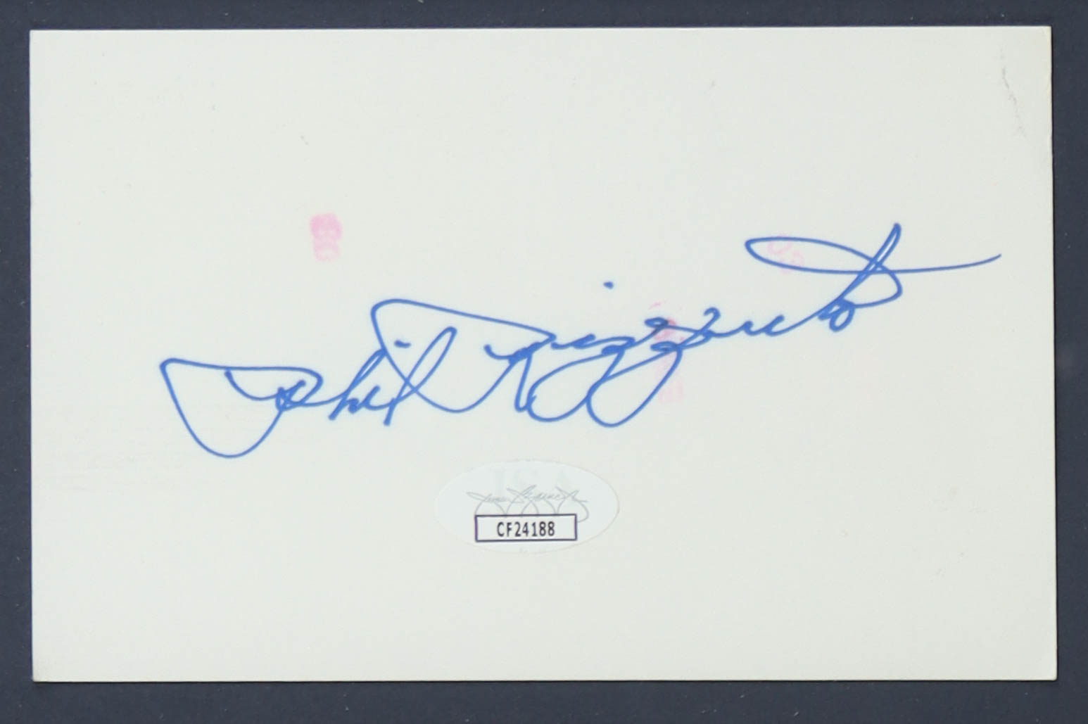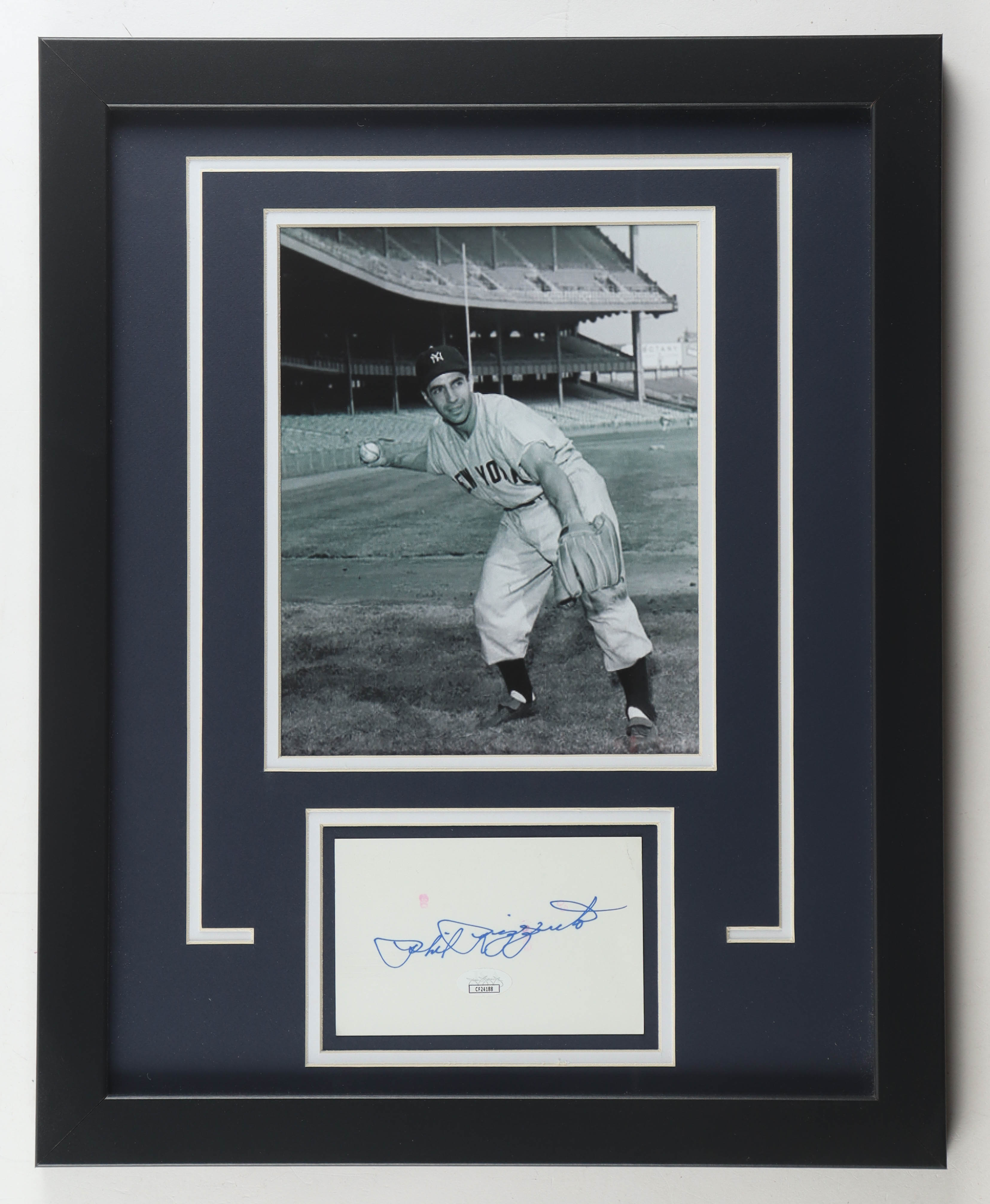 Custom frame measures 16" x 20" in size. Index card is hand-signed by Phil Rizzuto (New York Yankees). Display also includes an unsigned 8" x 10" photograph.