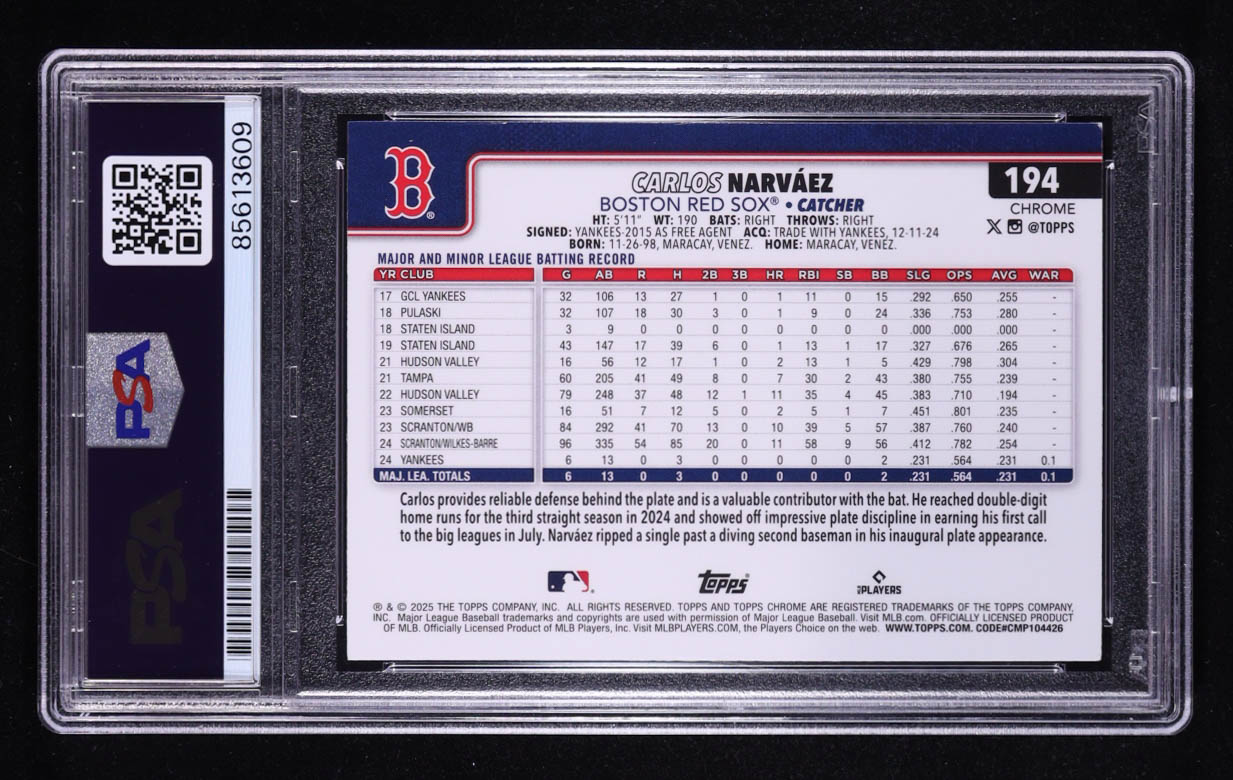Carlos Narvaez Signed 2025 Topps Chrome Teal Refractors #194 #208/299 RC (PSA Authentic | Auto 10)