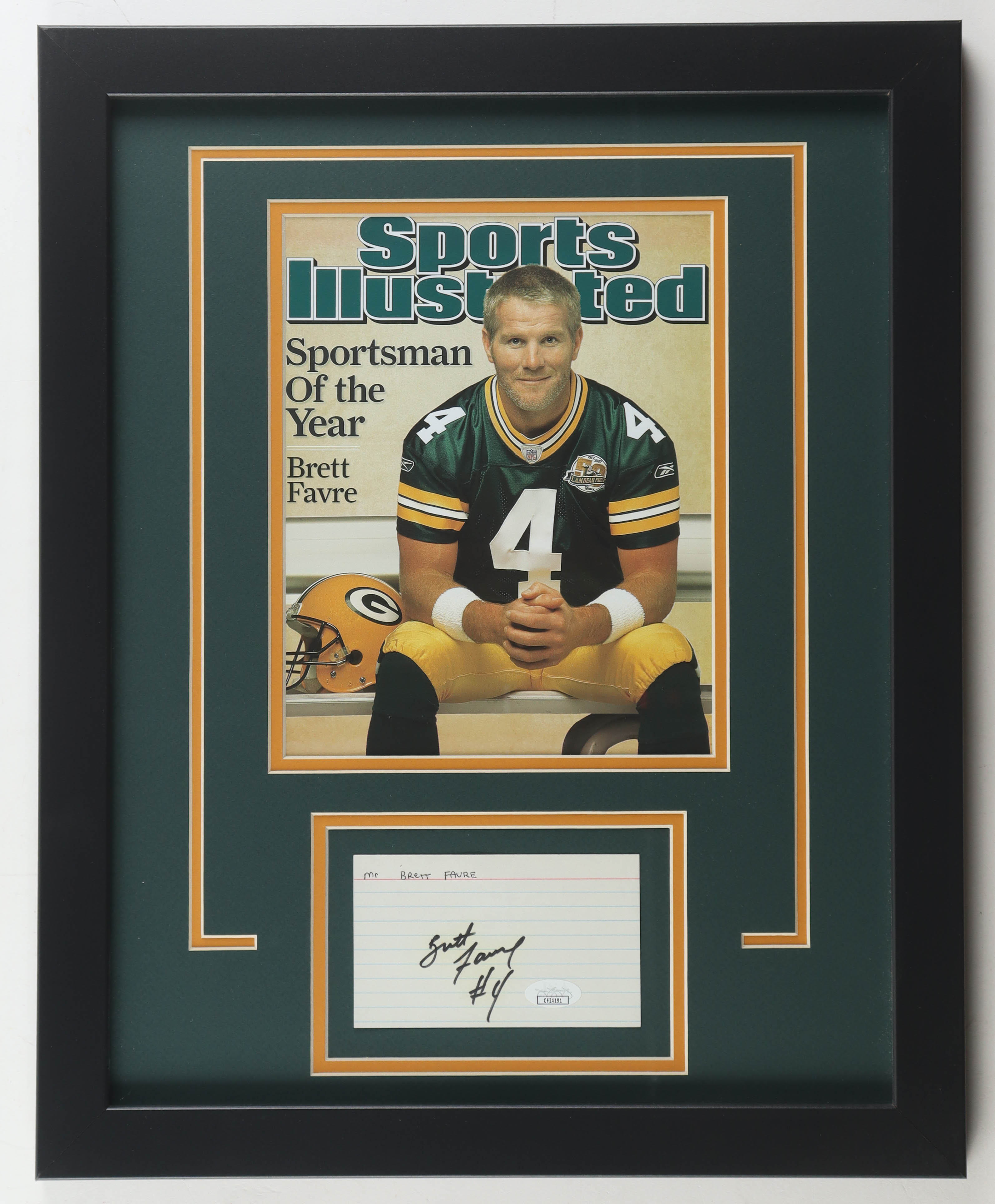 Custom frame measures 16" x 20" in size. Index card is hand-signed by Brett Favre (Green Bay Packers). Display also includes an unsigned 8" x 10" photograph.