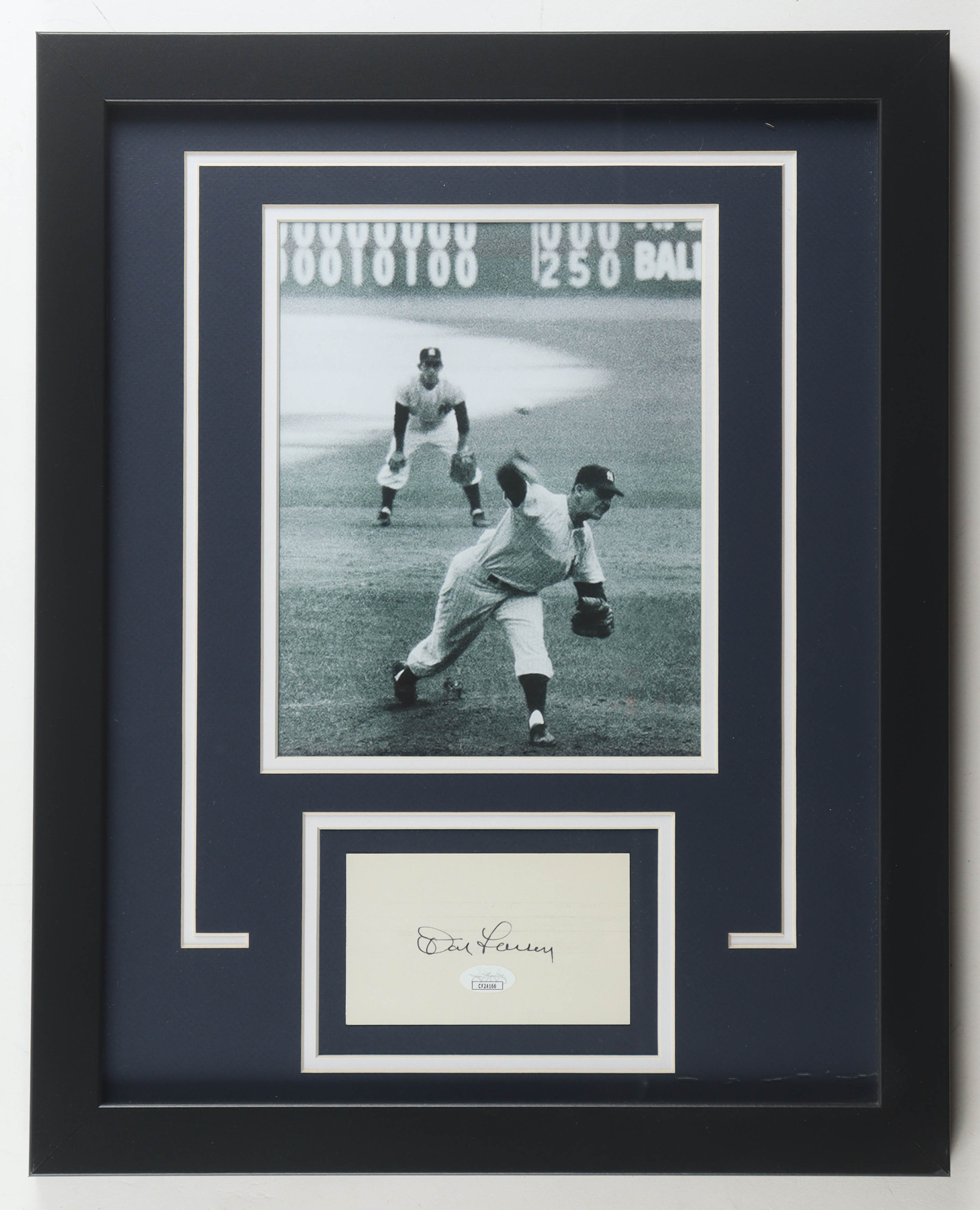 Custom frame measures 16" x 20" in size. Index card is hand-signed by Don Larsen (New York Yankees). Display also includes an unsigned 8" x 10" photograph.