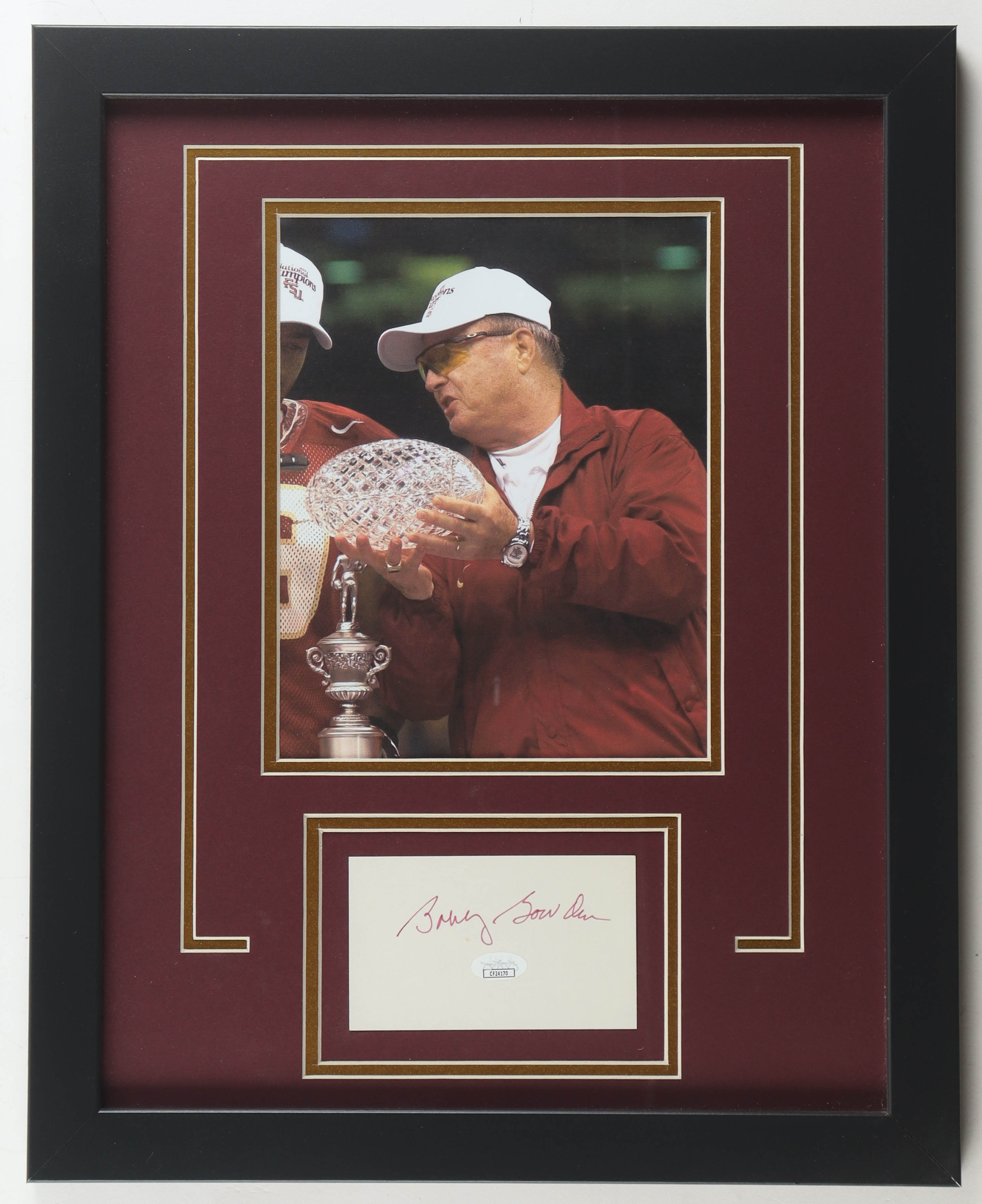 Custom frame measures 16" x 20" in size. Index card is hand-signed by Bobby Bowden. Display also includes an unsigned 8" x 10" photograph.