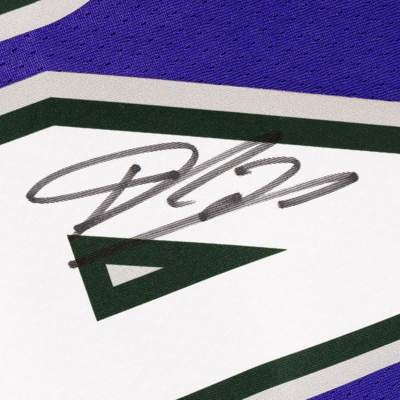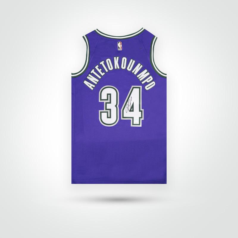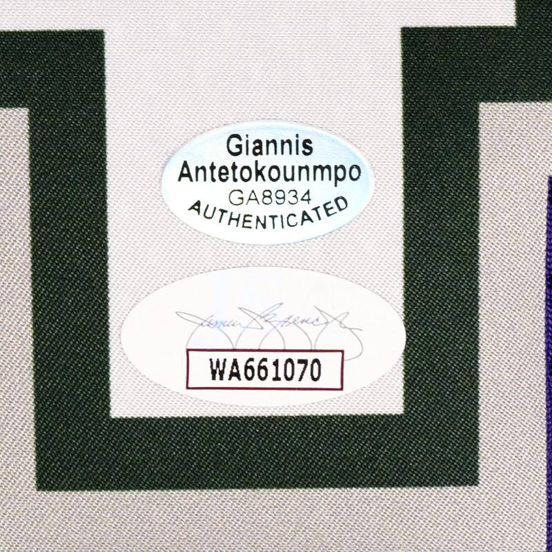 Nike jersey with everything pressed on, size 48. Hand-signed by Giannis Antetokounmpo (Milwaukee Bucks).