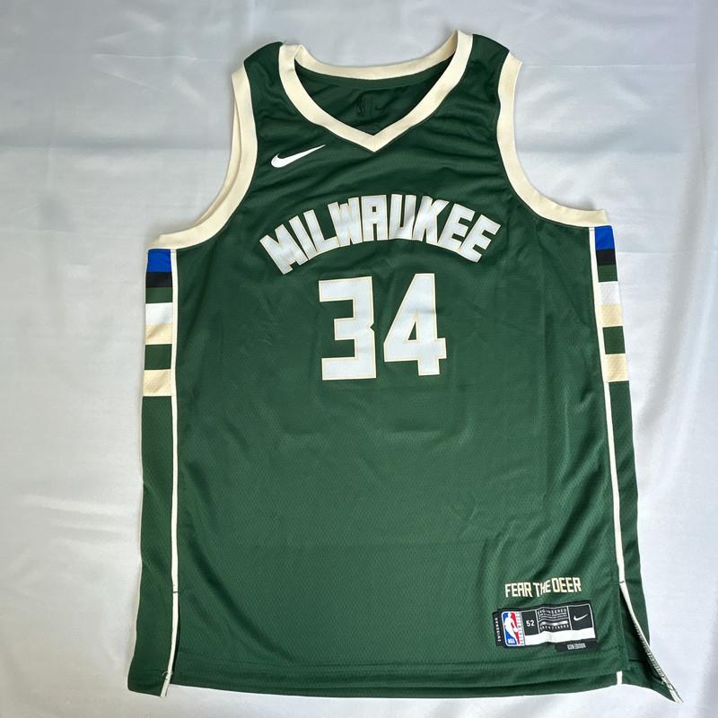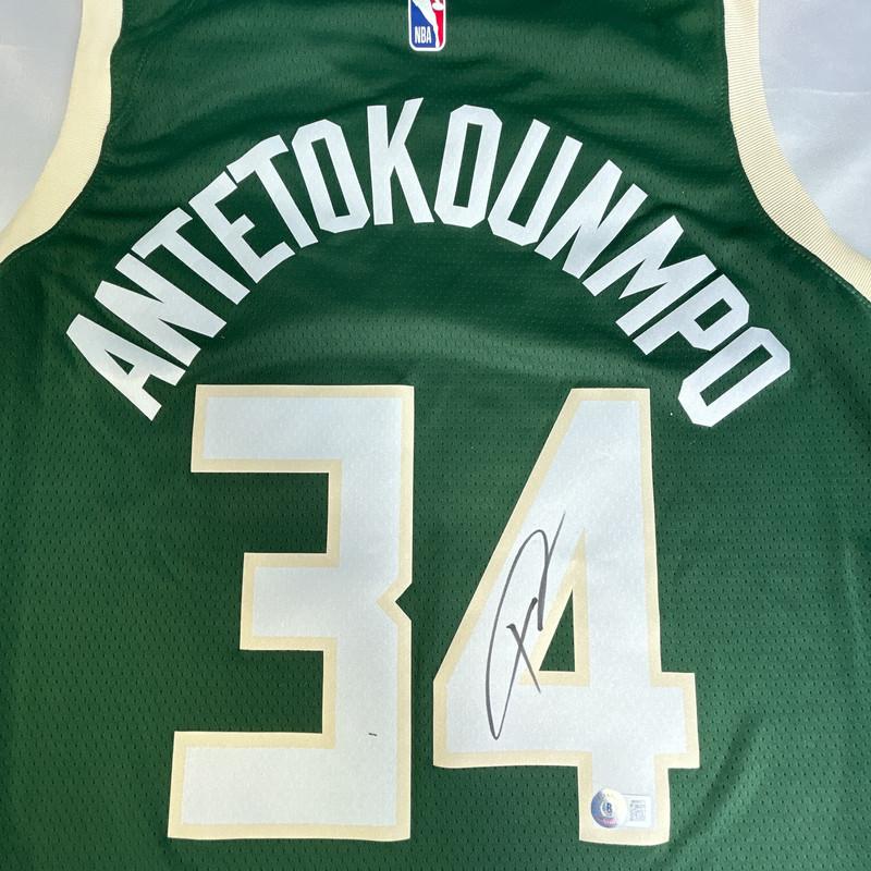 Nike jersey with everything pressed on, size L. Hand-signed by Giannis Antetokounmpo (Milwaukee Bucks).