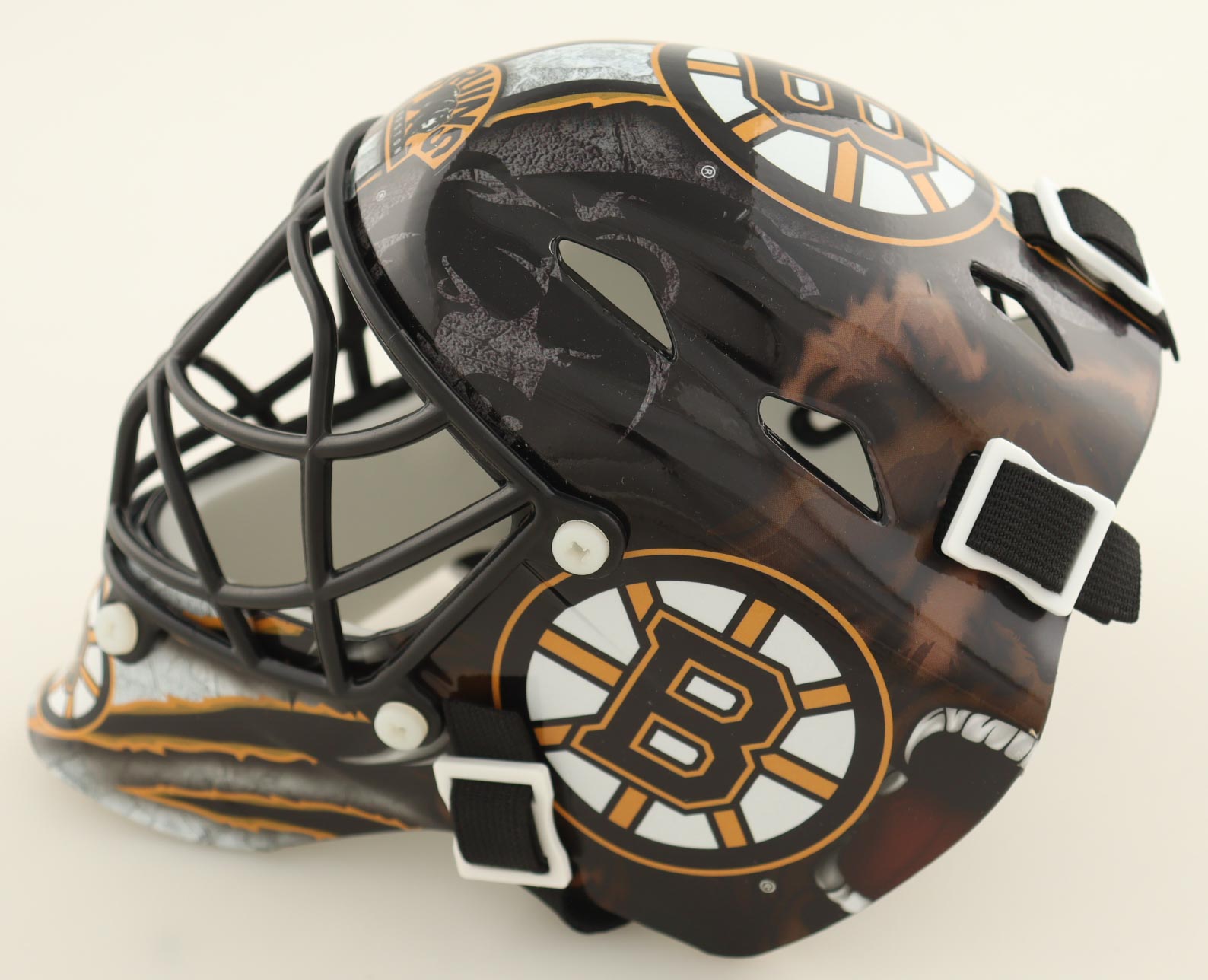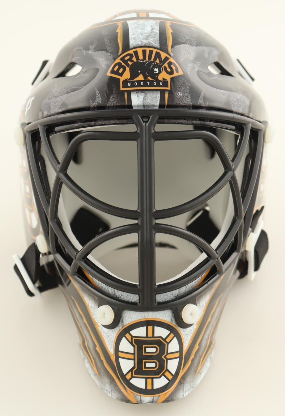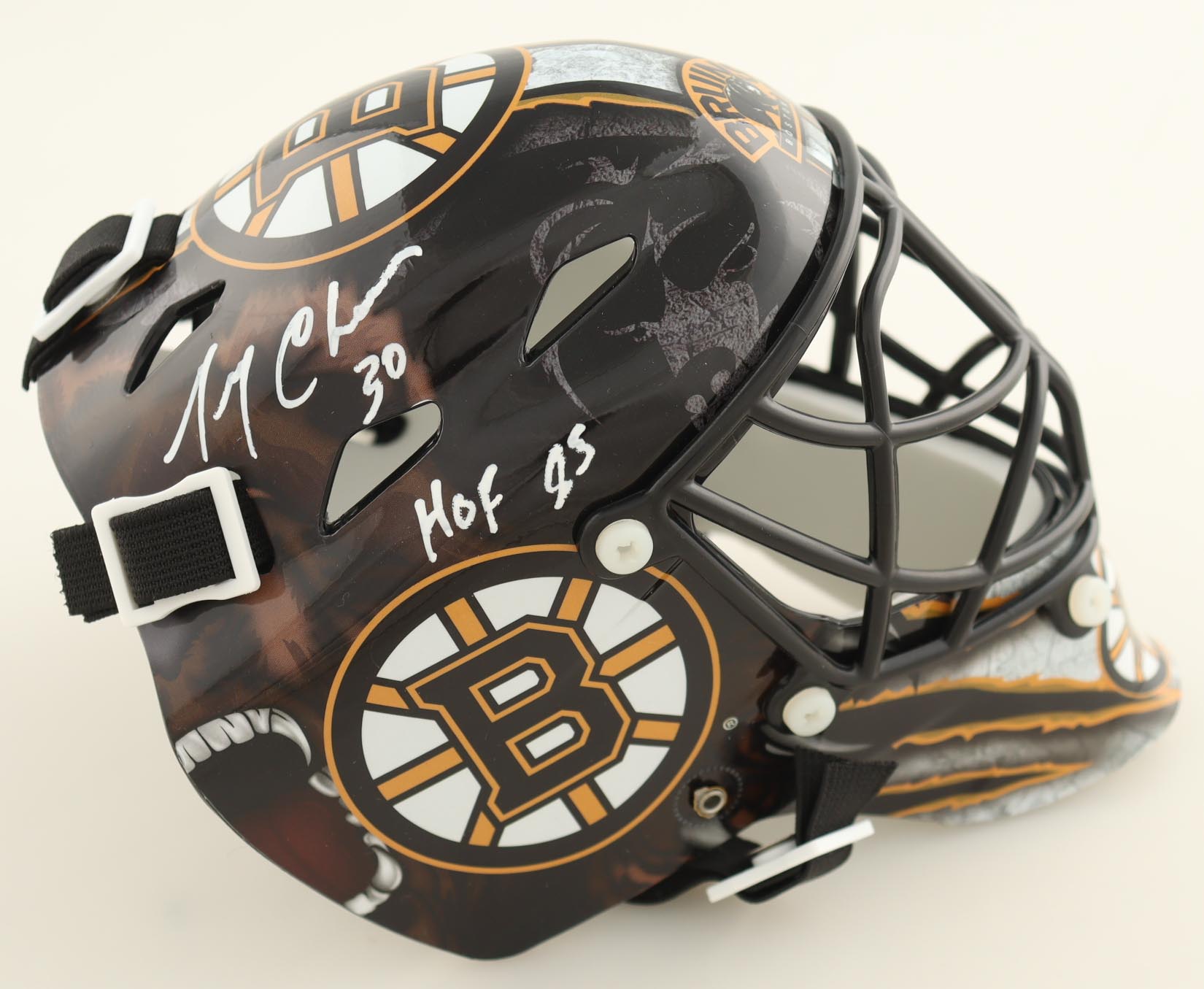 Boston Bruins mini goalie mask has been hand-signed and inscribed by Gerry Cheevers (HOF).