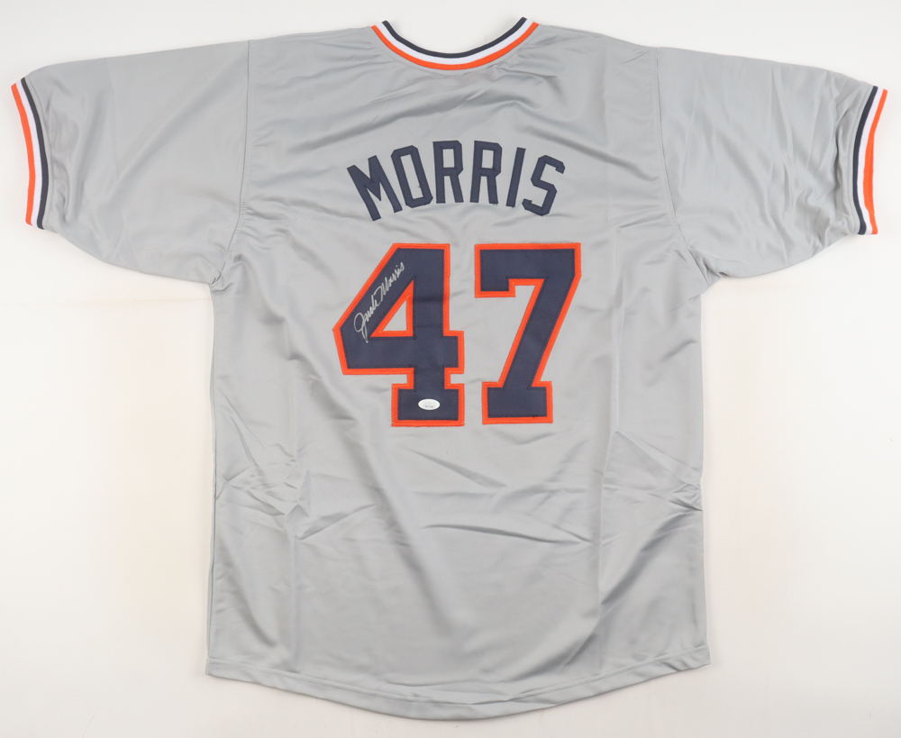 Custom jersey with everything sewn on, size XL. Hand-signed by Jack Morris (Detroit Tigers, HOF).