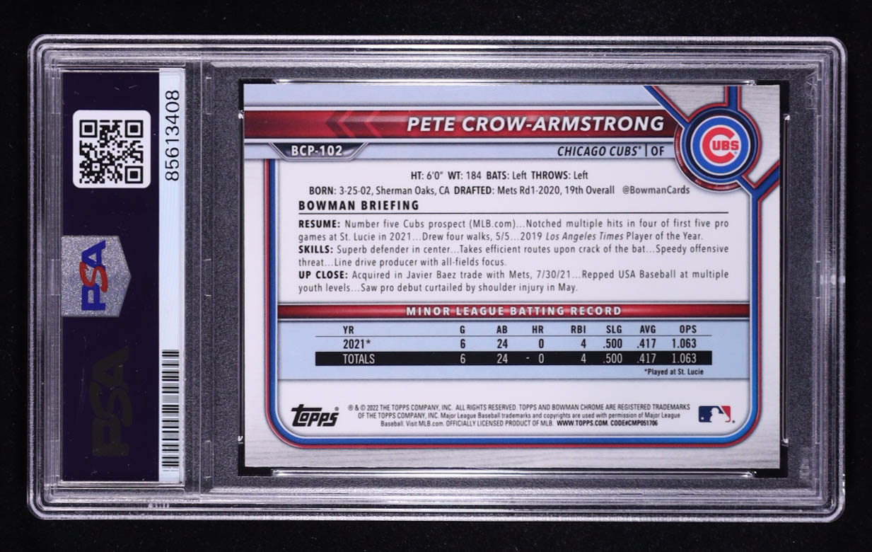 Pete Crow-Armstrong Signed 2022 Bowman Chrome Prospects #BCP102 RC (PSA Authentic | Auto 10)