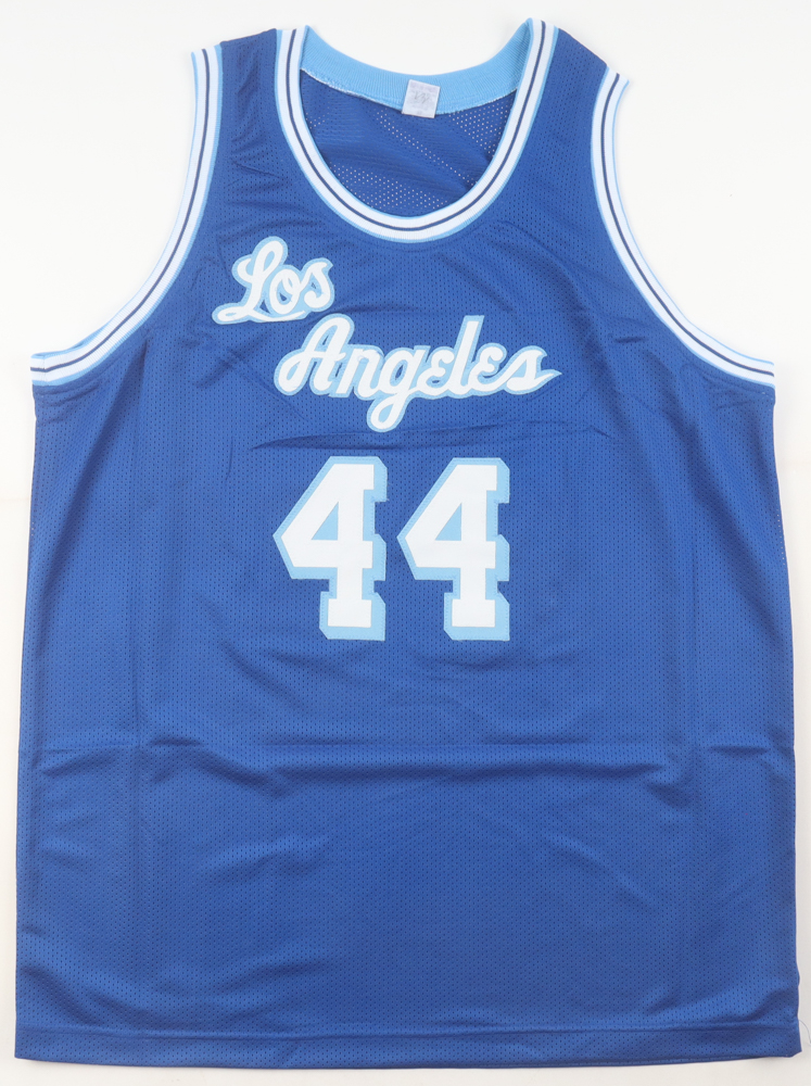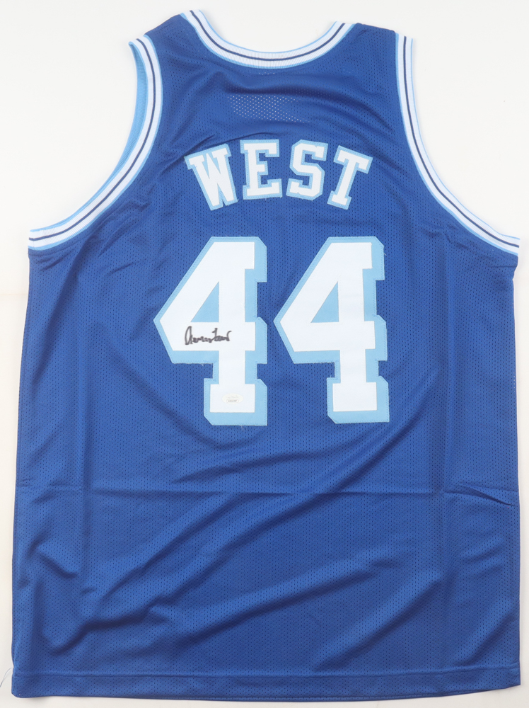 Custom jersey with everything sewn on, size XL. Hand-signed by Jerry West (D. 2024, Los Angeles Lakers, HOF).