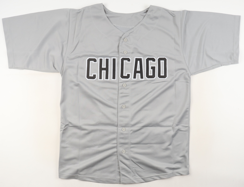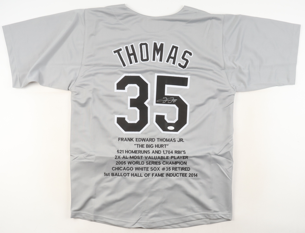 Custom jersey with everything sewn on, size XL. Hand-signed by Frank Thomas (Chicago White Sox, HOF). Thomas's career highlights have been custom stitched onto the back of the jersey below the reverse numbers.