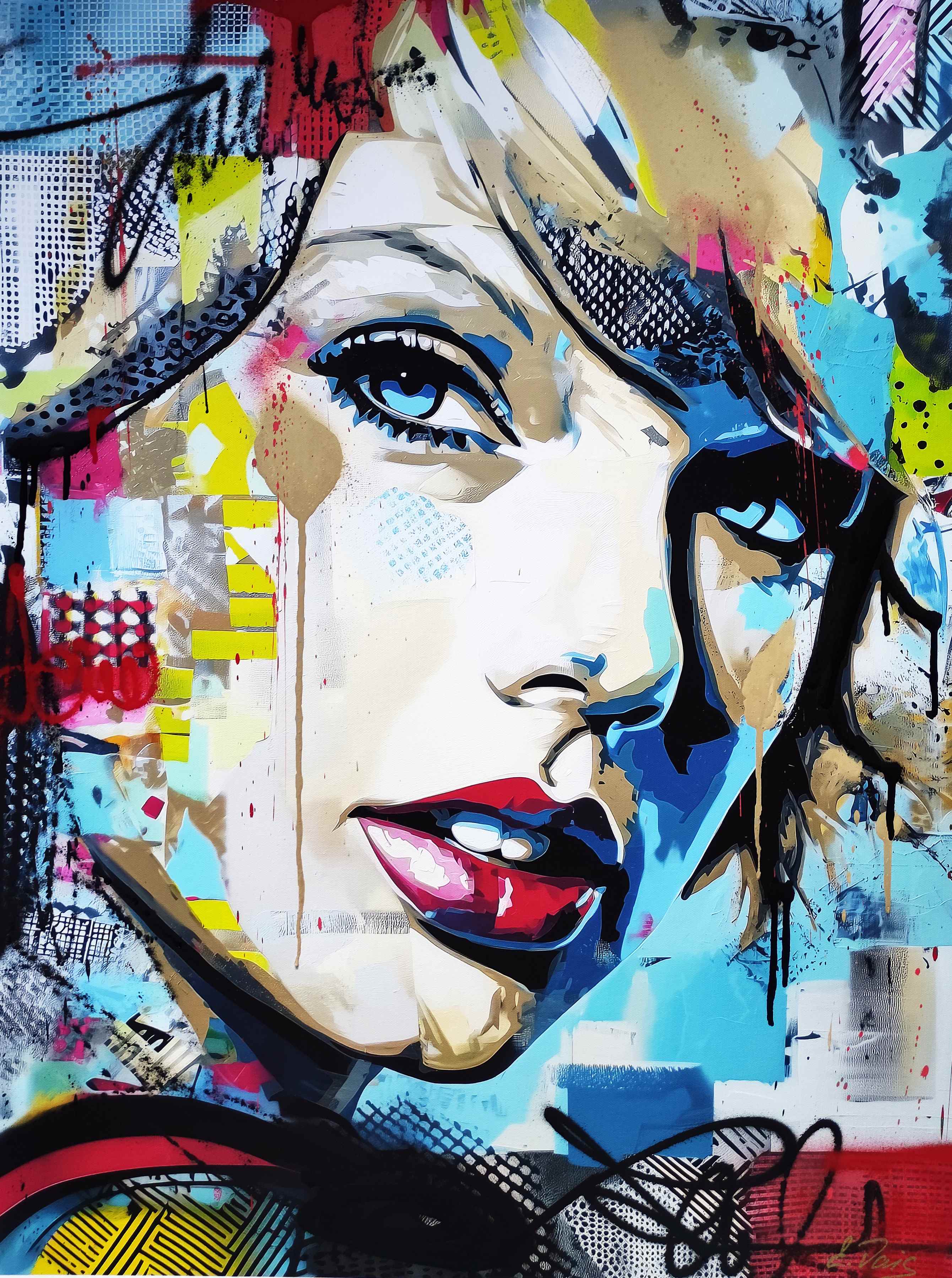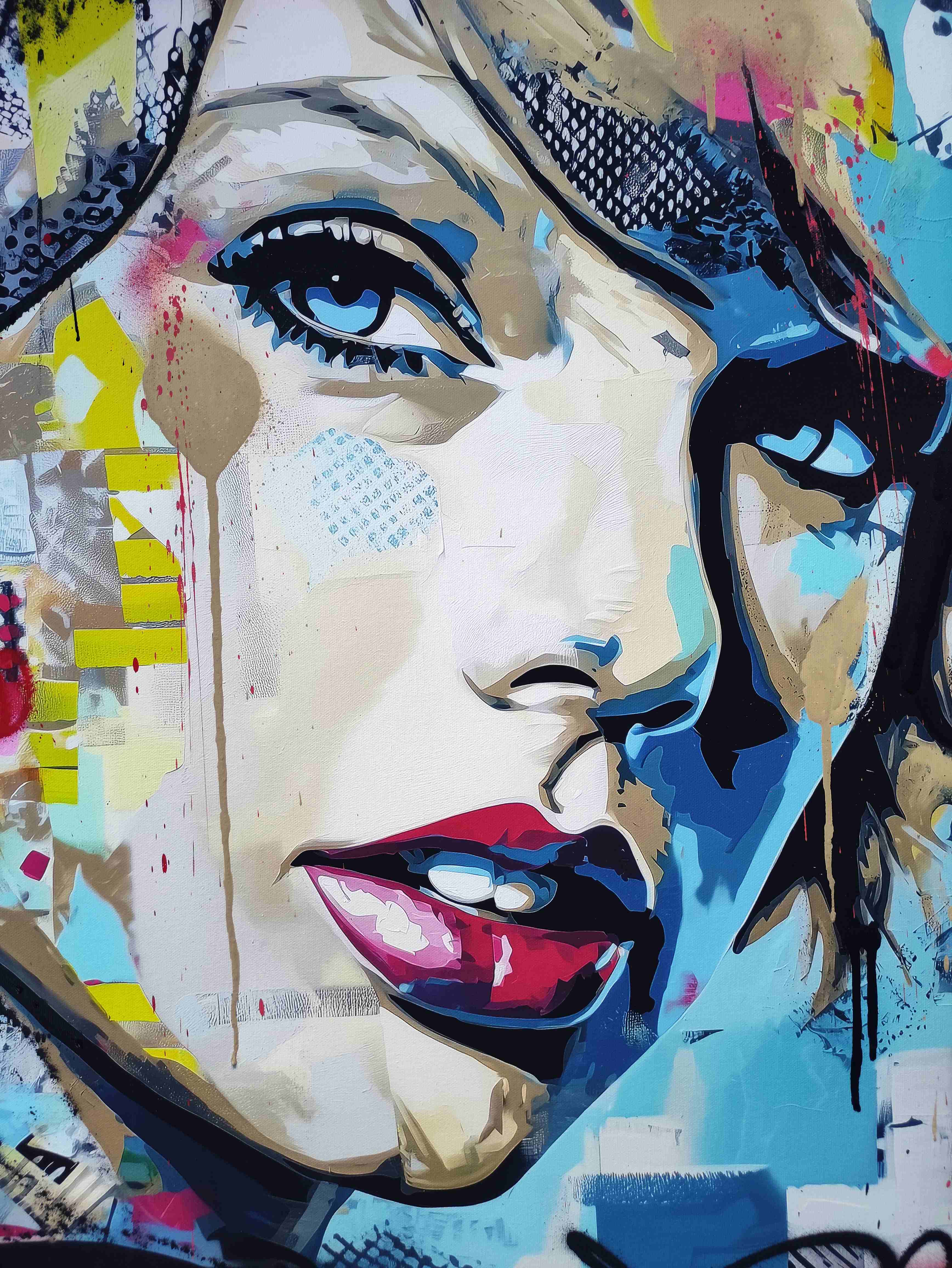 2025 "Splatter Queen" 24" x 32" acrylic spray paint painting on canvas featuring Taylor Swift. Signed by artist, Elena Vaisman. Date and signed on the back. Please refer to photos for more details on the condition of the item.