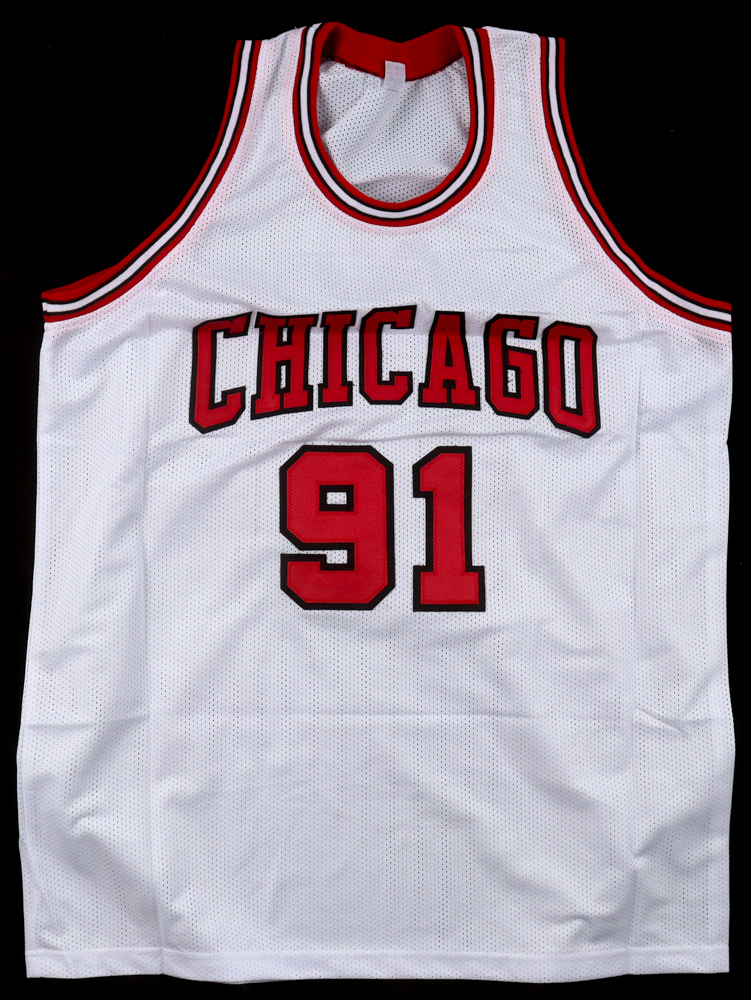 Custom jersey with everything pressed on, size XL. Hand-signed by Dennis Rodman (Chicago Bulls, HOF).