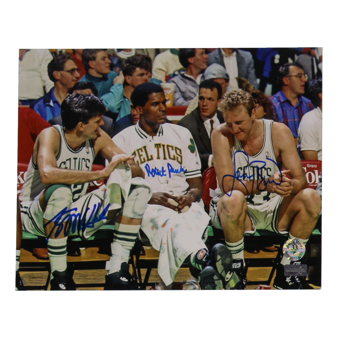 Photo measures 8" x 10" in size. Hand-signed by Larry Bird (HOF), Robert Parish (HOF) and Kevin McHale (Boston Celtics, HOF).