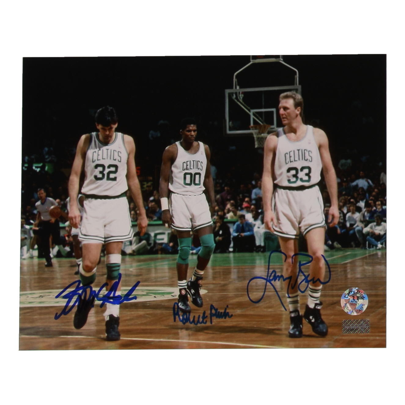 Photo measures 8" x 10" in size. Hand-signed by Larry Bird (HOF), Robert Parish (HOF) and Kevin McHale (Boston Celtics, HOF).