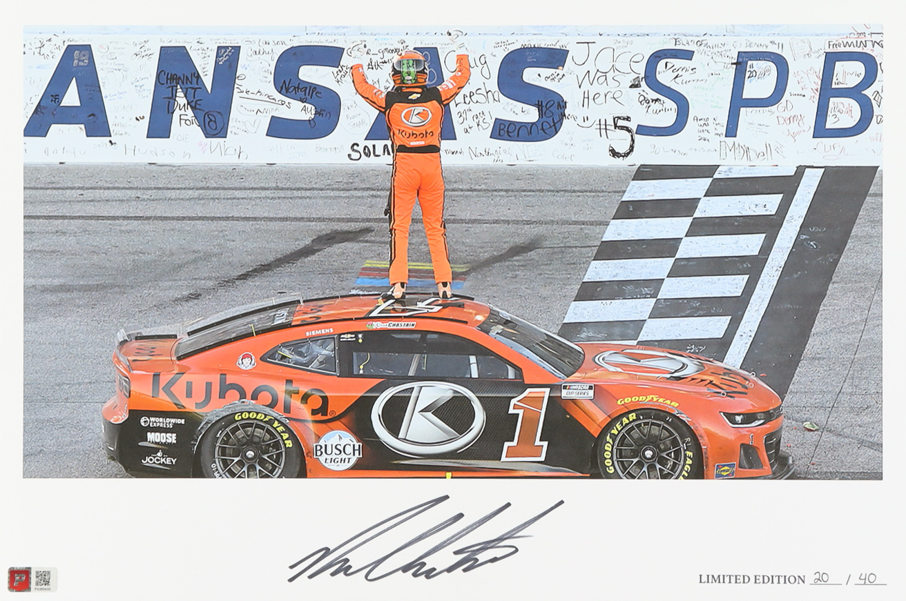 Print measures 12" x 18" in size and has been hand-signed by Ross Chastain. Please note, you will receive a randomly limited edition / 40 numbered print.