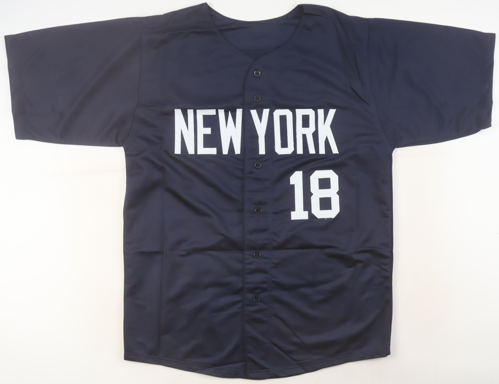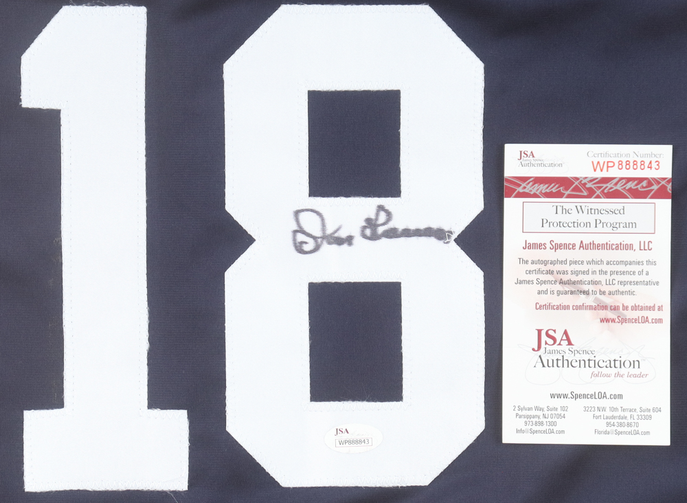 Custom jersey with everything sewn on, size XL. Hand-signed by Don Larsen (D. 2020, New York Yankees). Larsen' s career highlights have been custom stitched onto the back of the jersey below the reverse numbers.