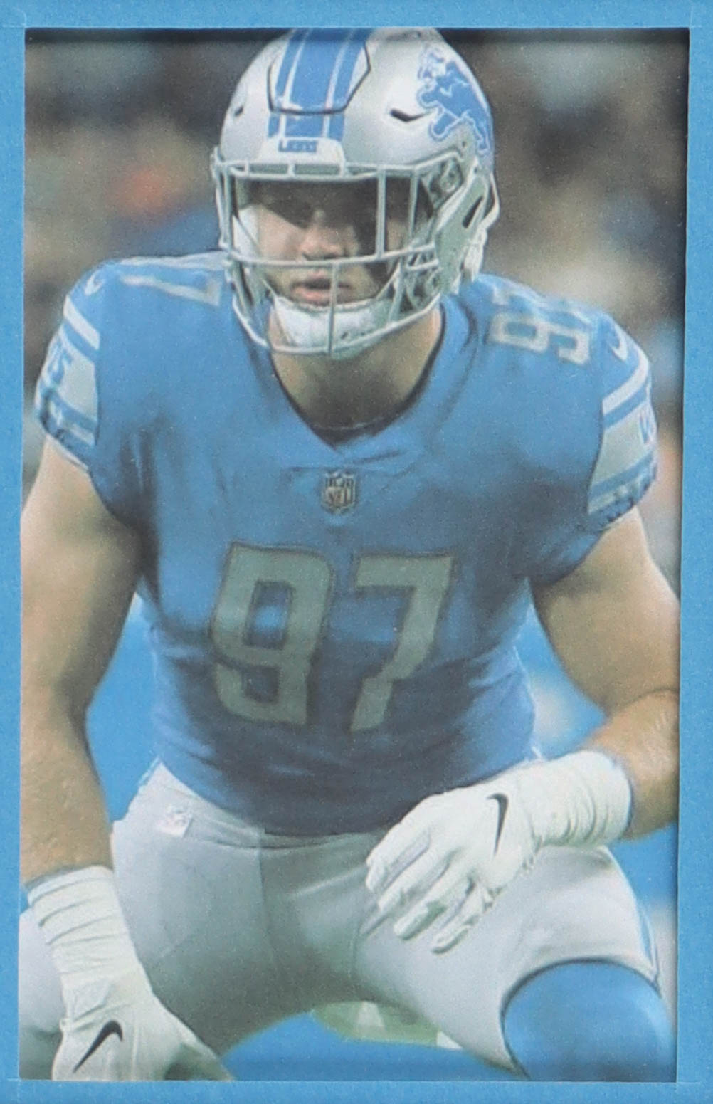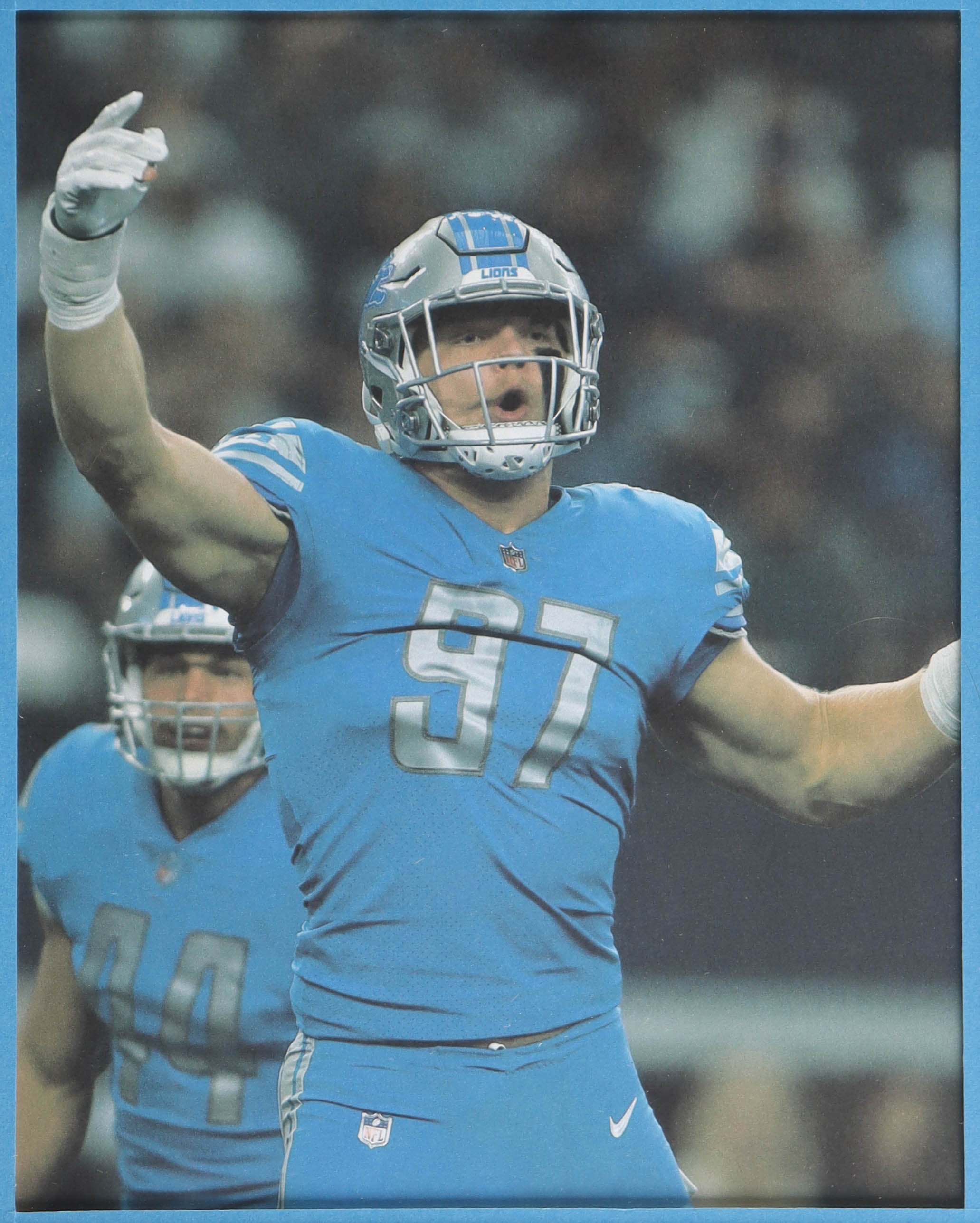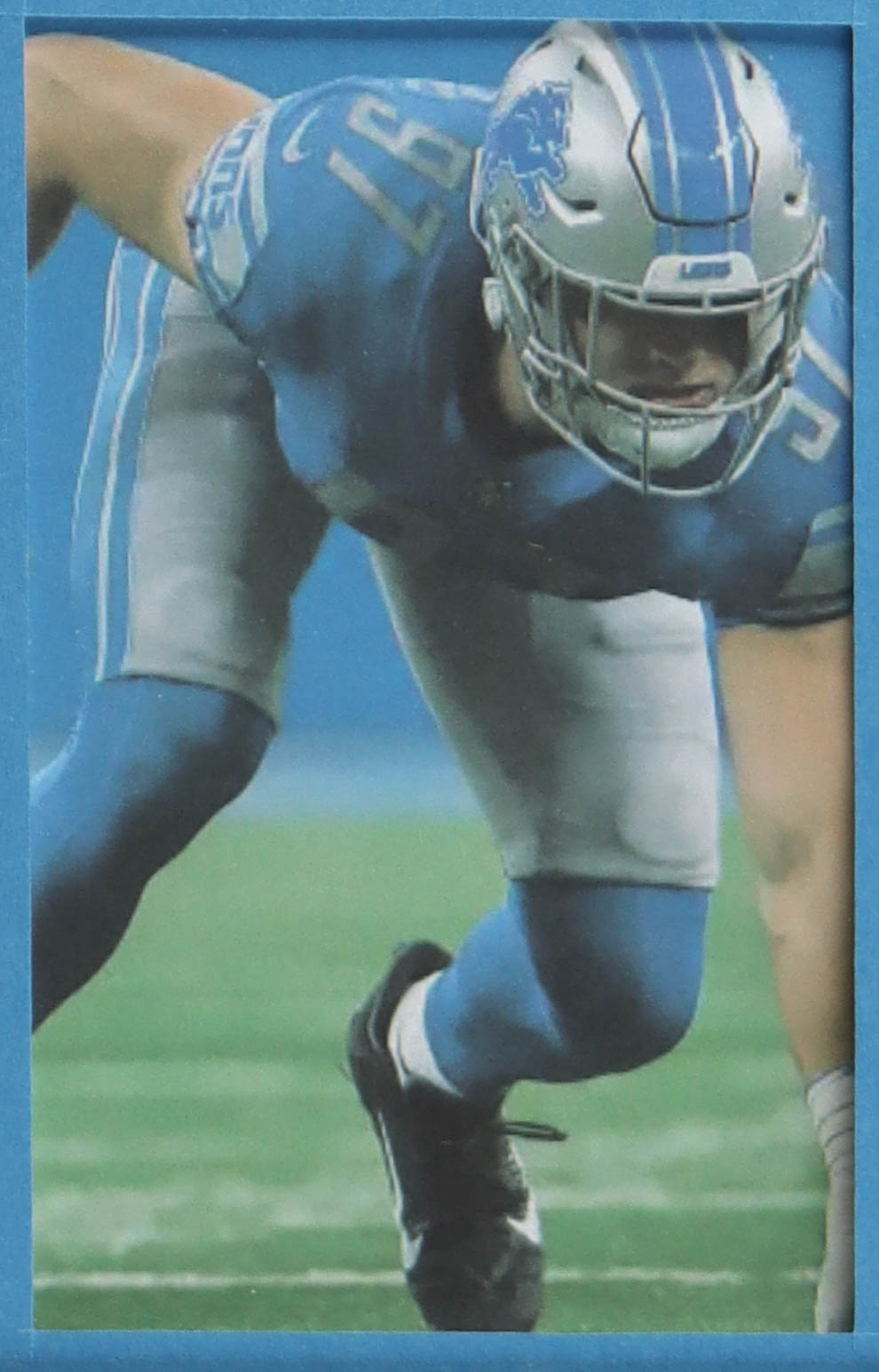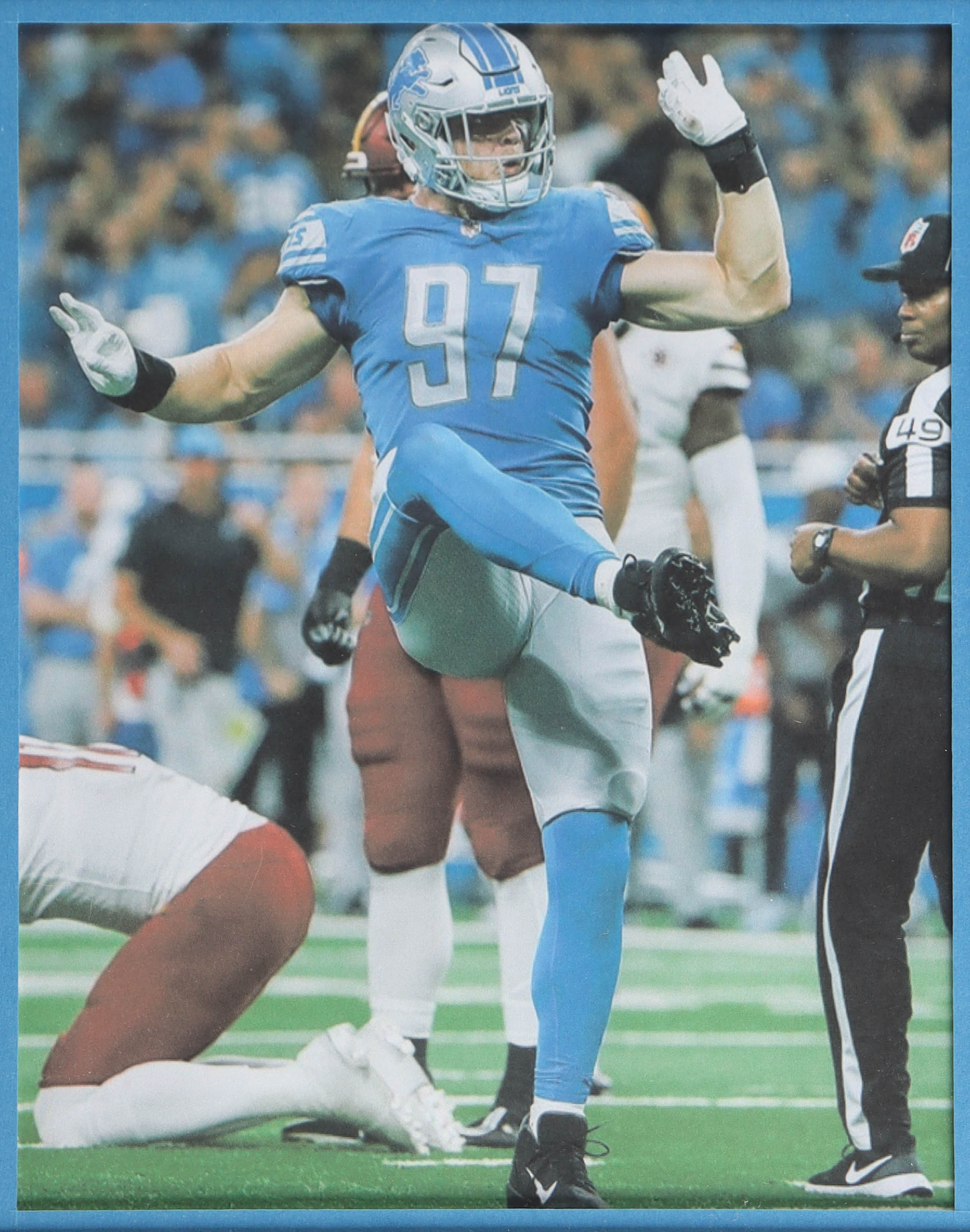 Custom frame measures 34" x 42" in size. Jersey has been hand-signed by Aiden Hutchinson (Detroit Lions). Display also includes (4) unsigned photographs and a team logo patch.