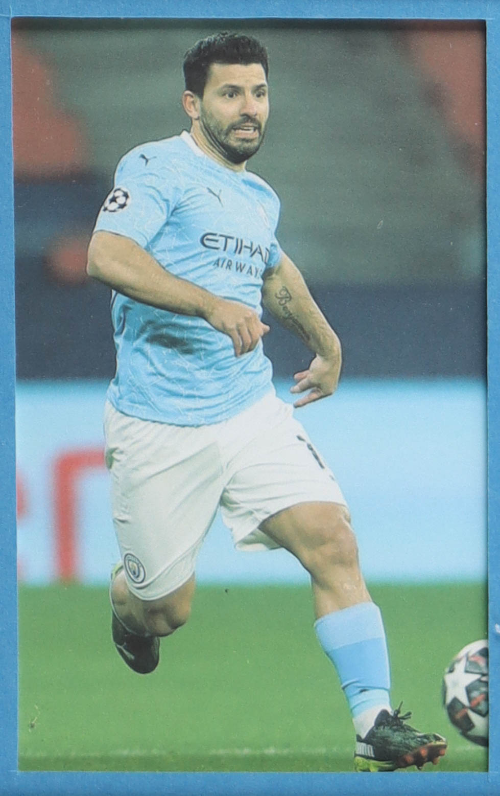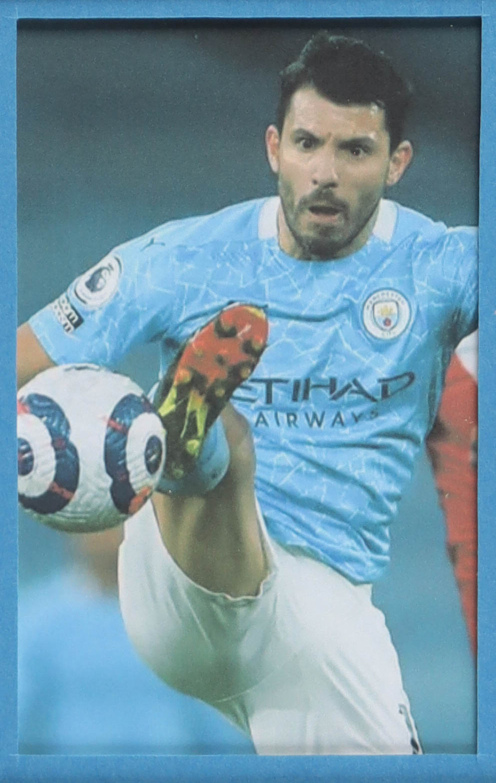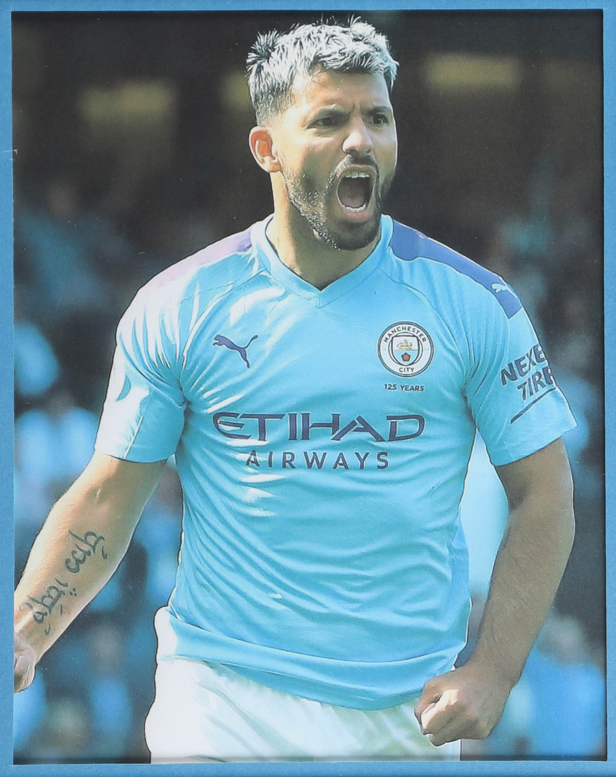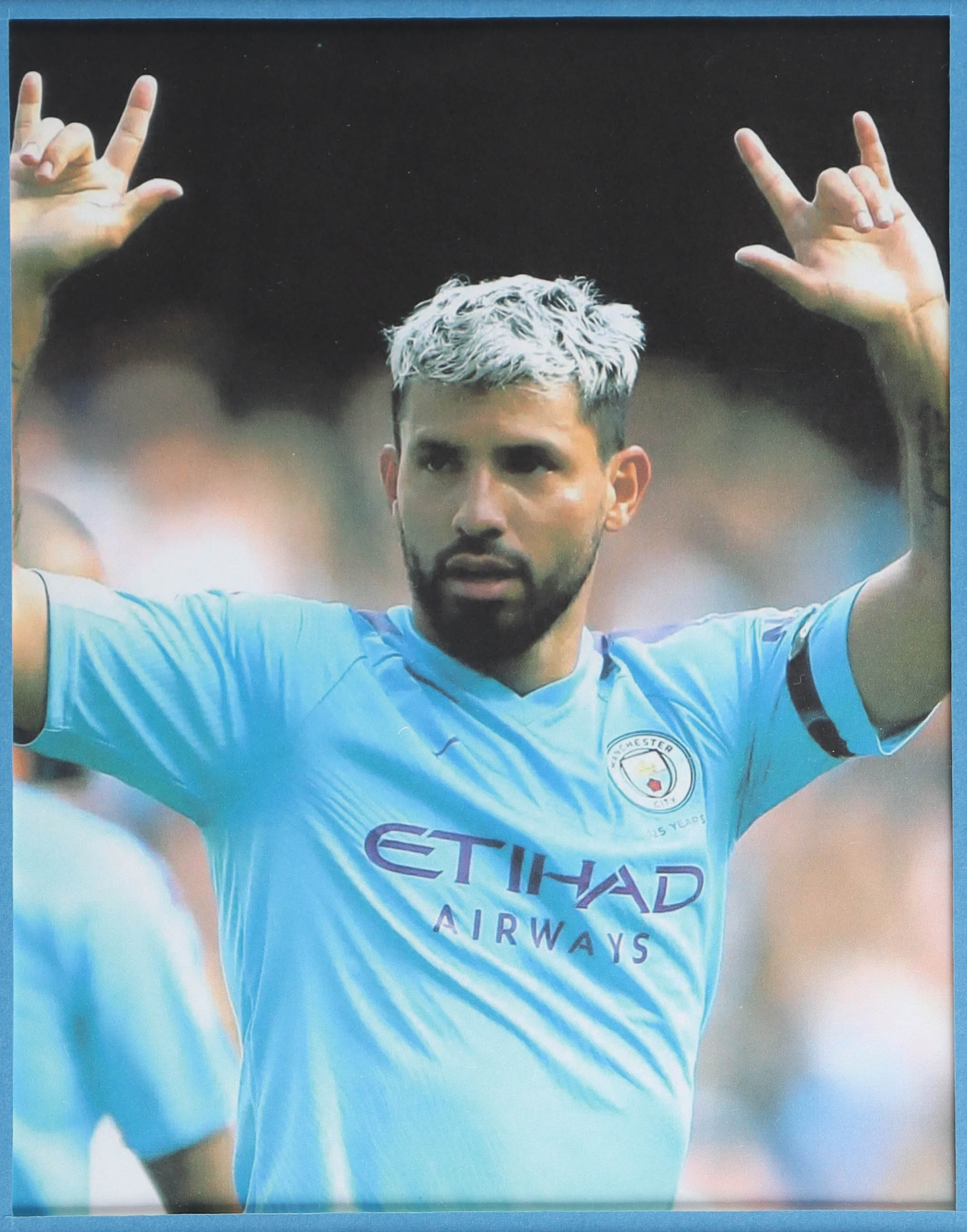 Custom frame measures 34" x 42" in size. Jersey has been hand-signed by Sergio Kun Aguero (Manchester City FC). Display also includes (4) unsigned 8" x 10" photographs and a team patch.