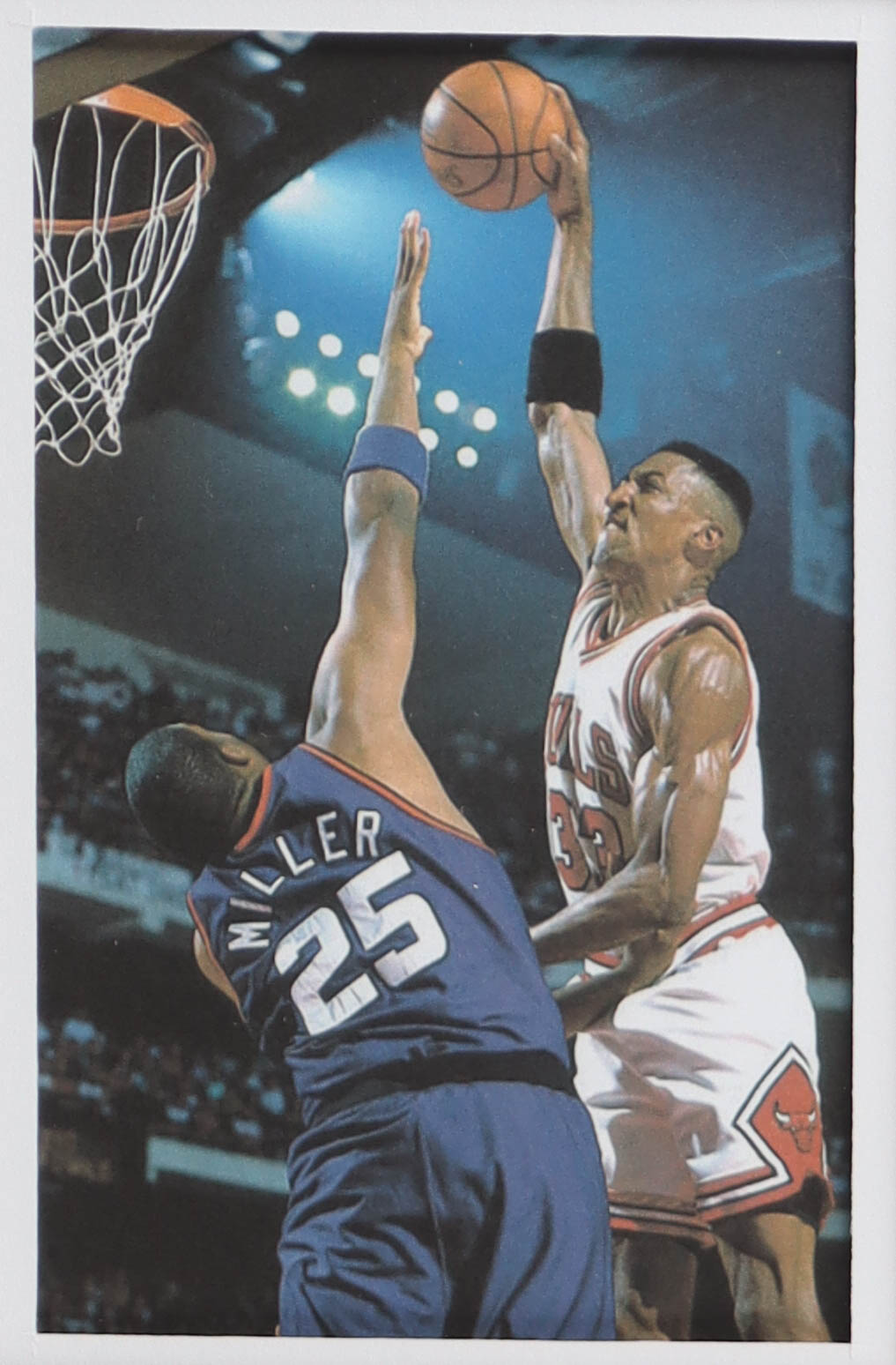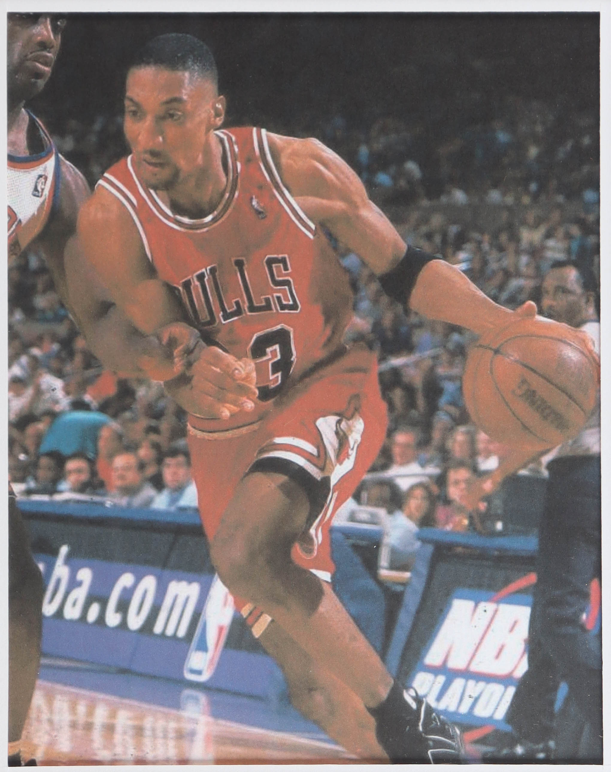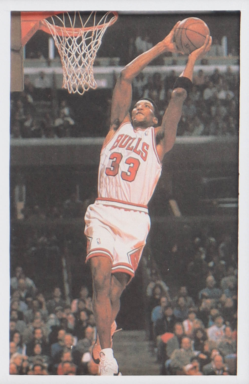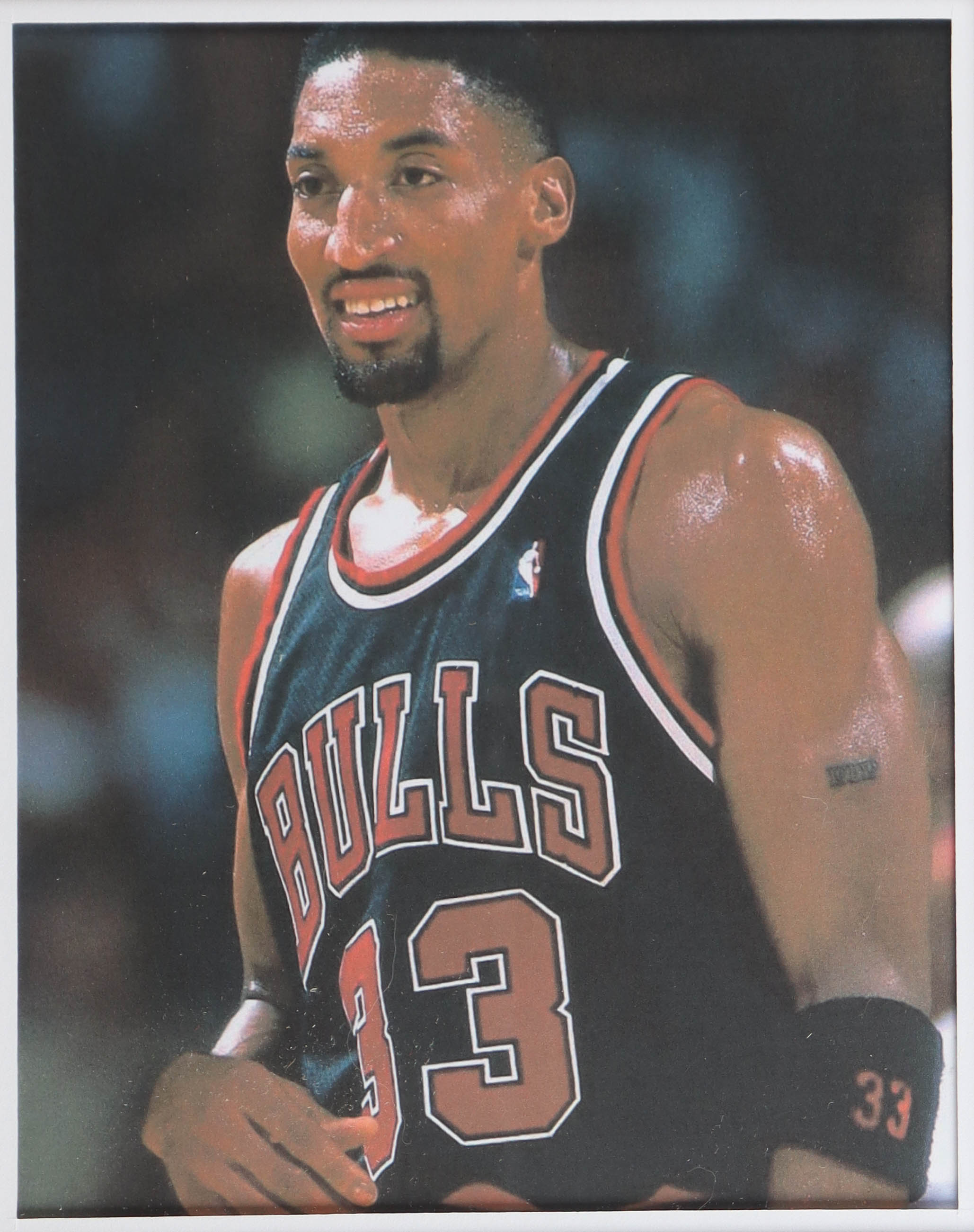 Custom frame measures 34" x 42" in size. Jersey has been hand-signed by Scotty Pippen (Chicago Bulls). Display also includes (4) unsigned photographs and a team logo patch.