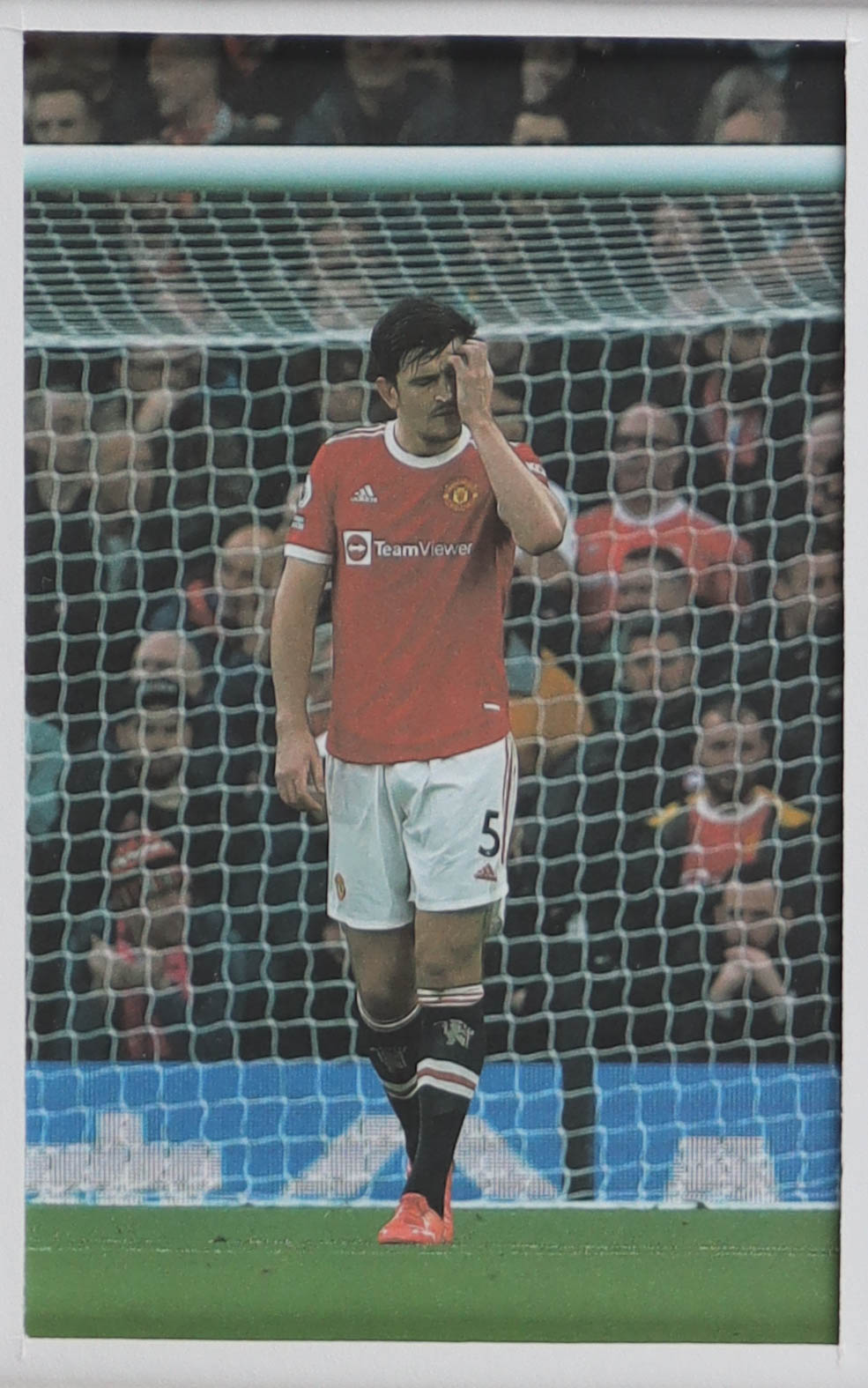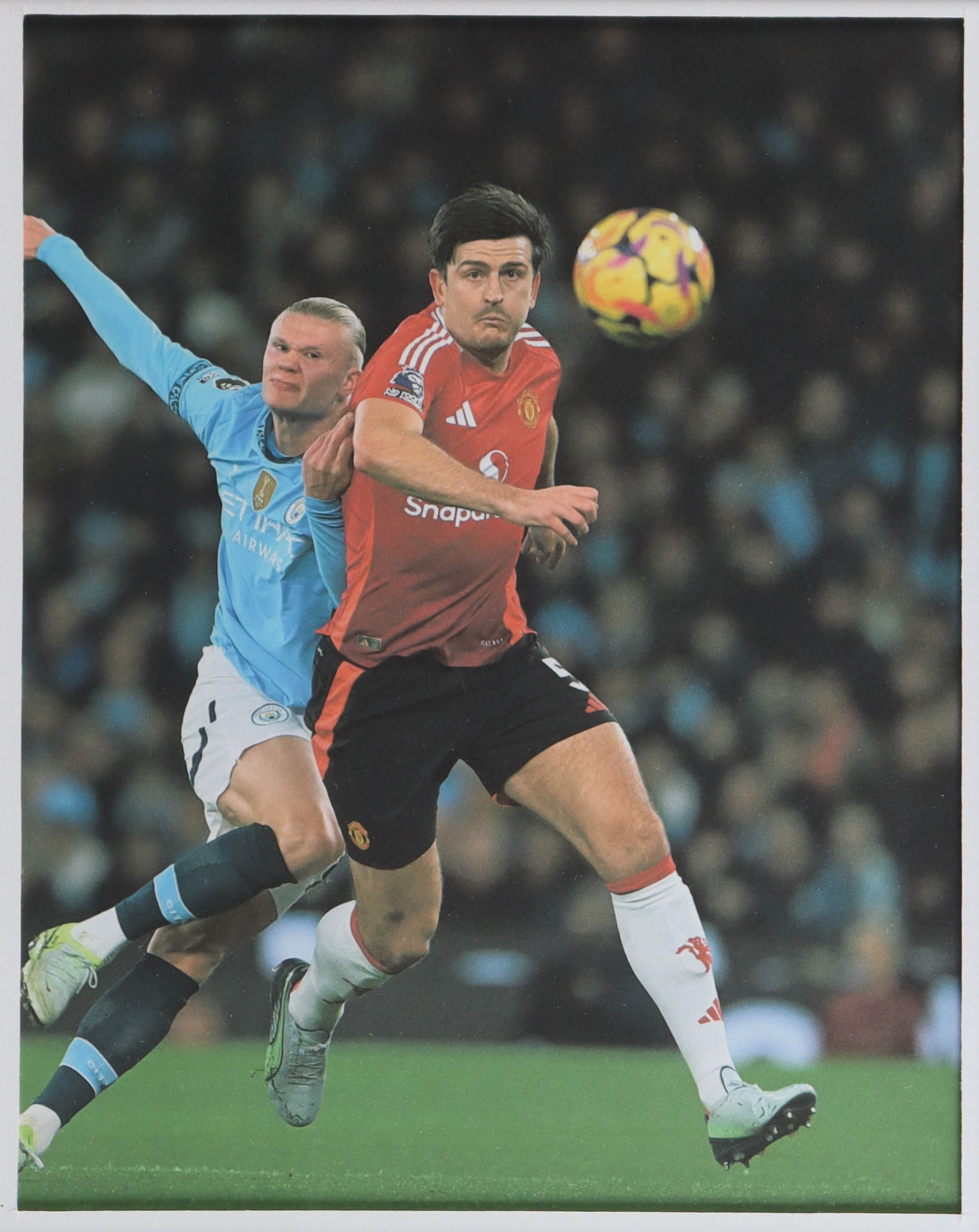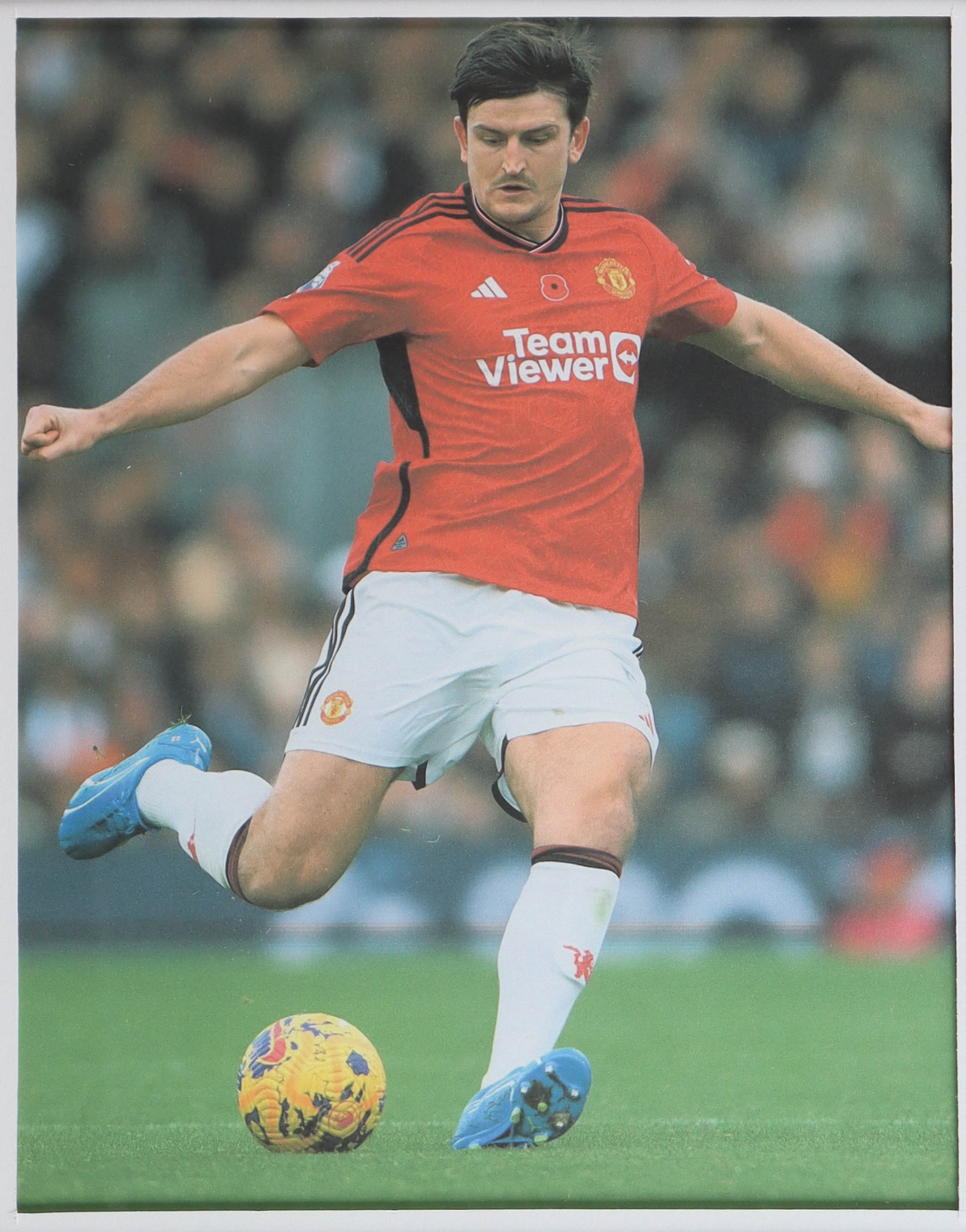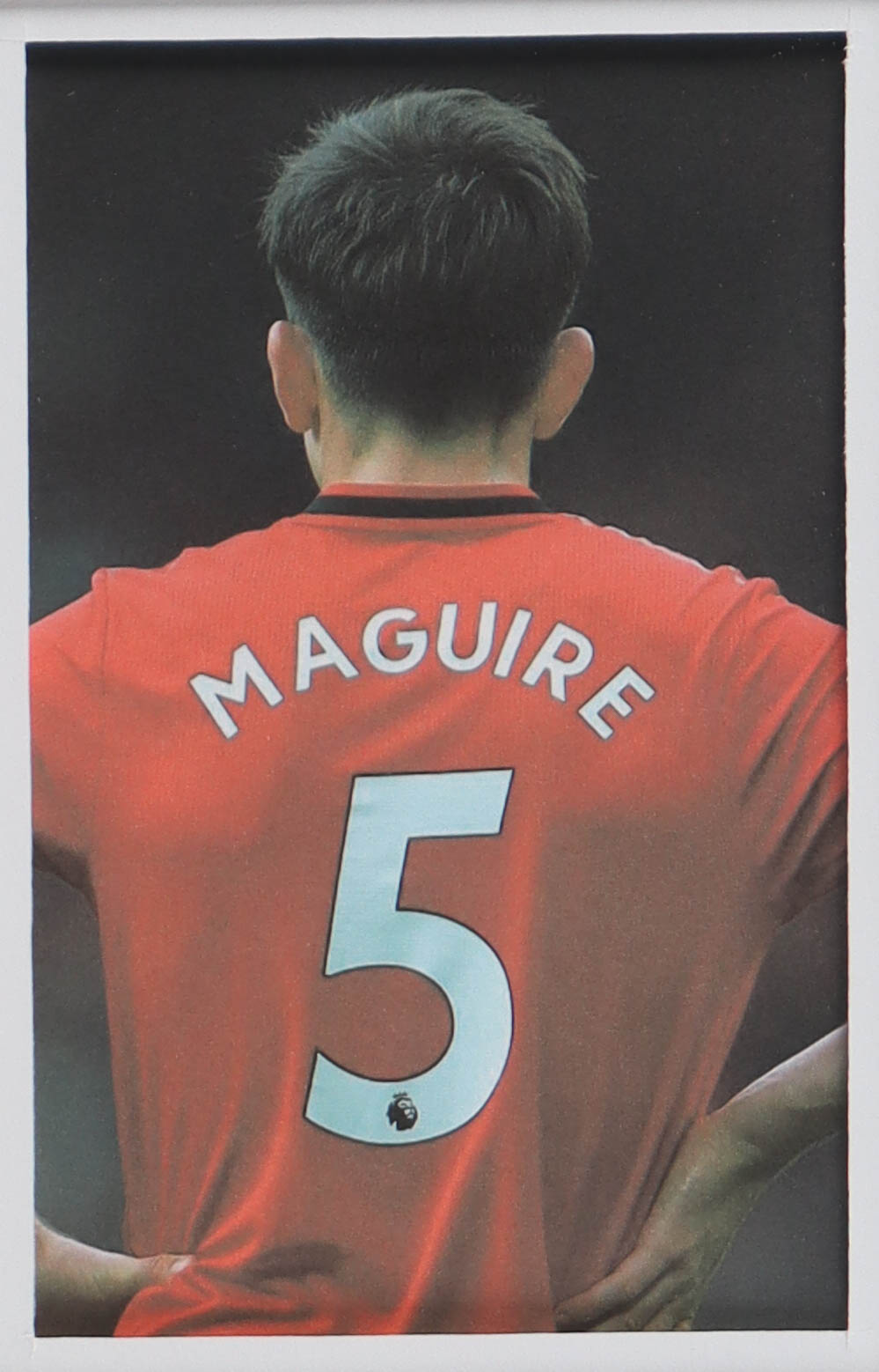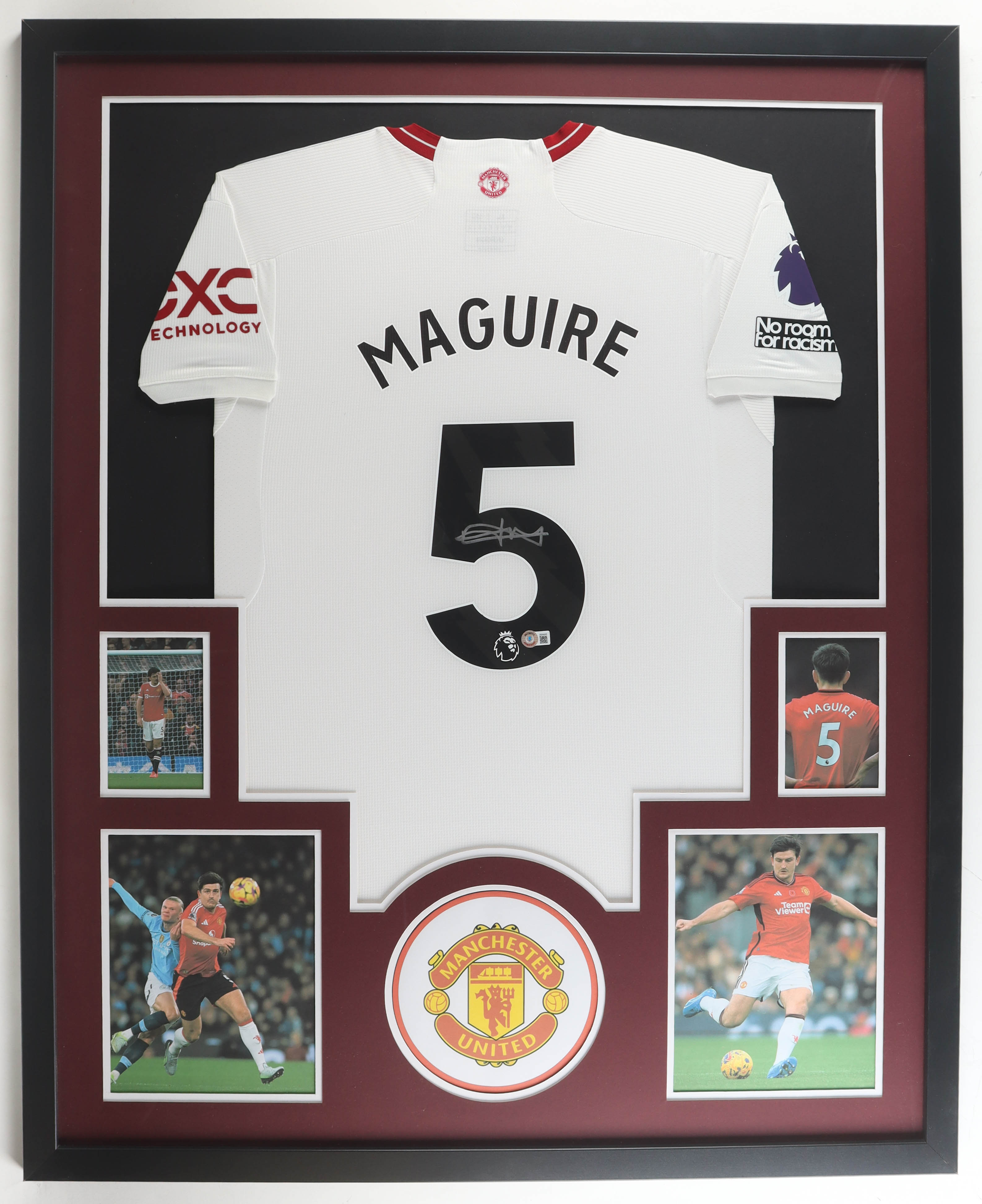 Custom frame measures 34" x 42" in size. Jersey has been hand-signed by Harry Maguire (Manchester United FC). Display also includes (4) unsigned 8" x 10" photographs and a team patch.
