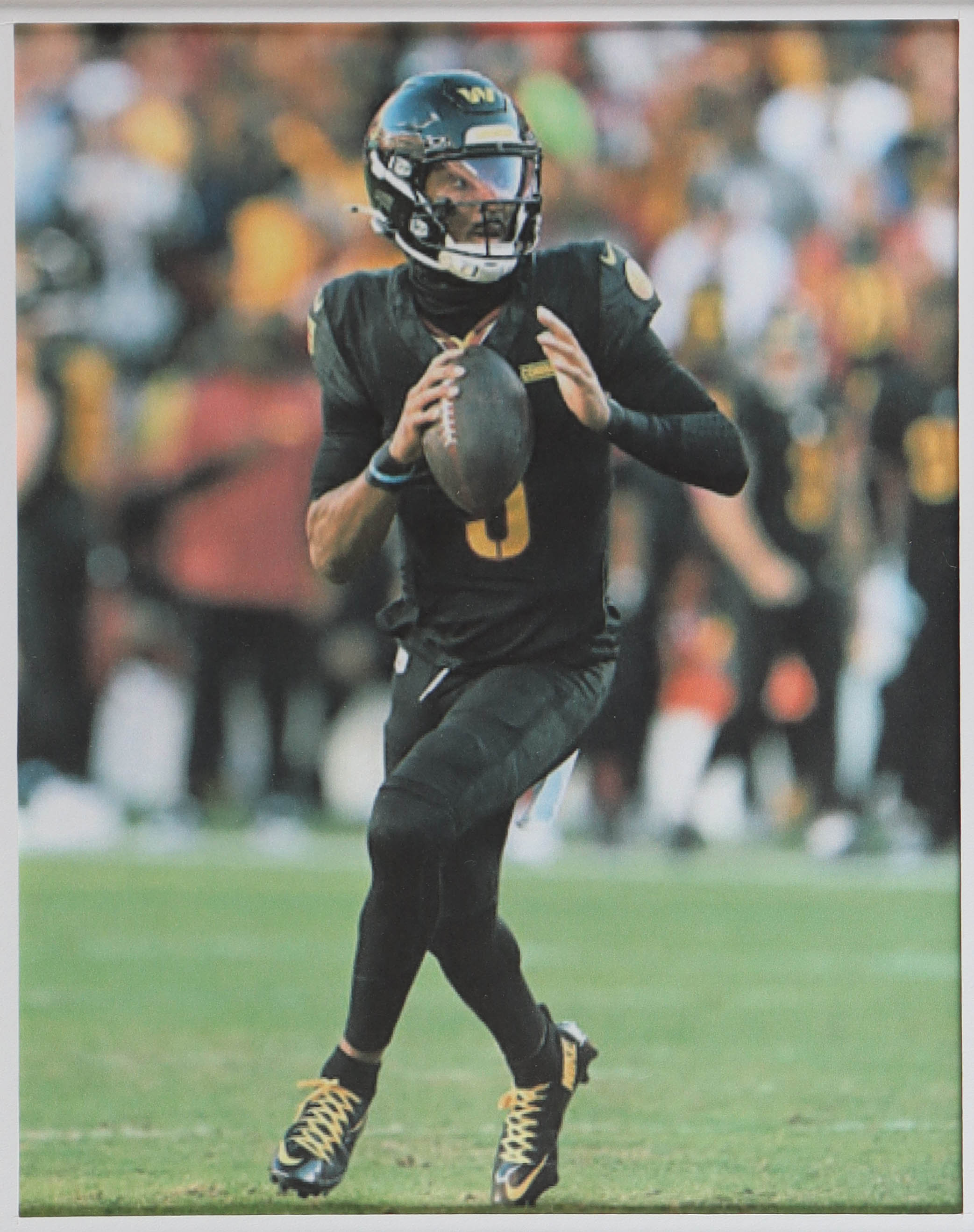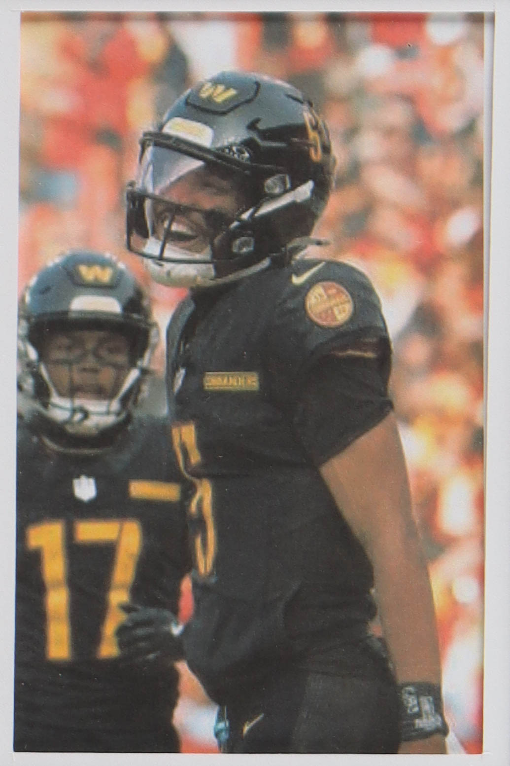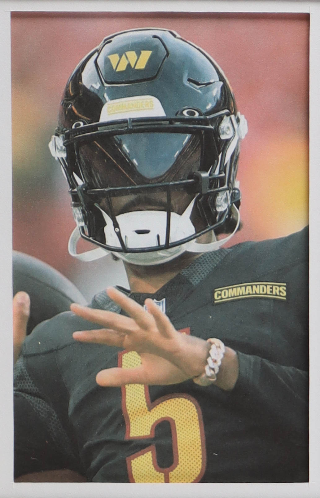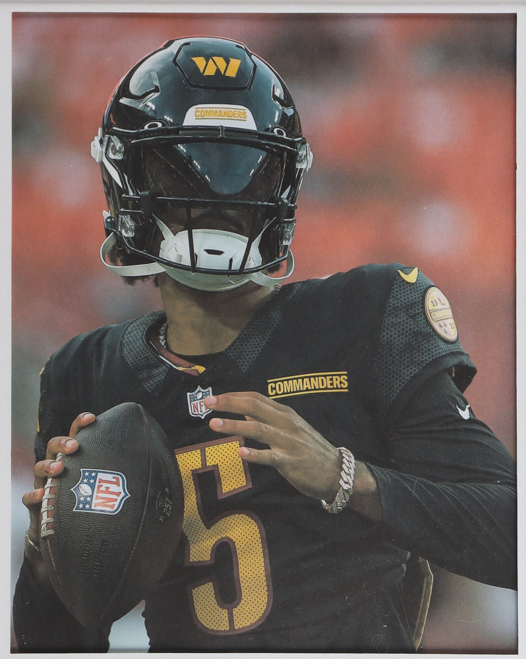 Custom frame measures 34" x 42" in size. Jersey has been hand-signed by Jayden Daniels (Washington Commanders). Display also includes (4) unsigned photographs and a team logo patch.