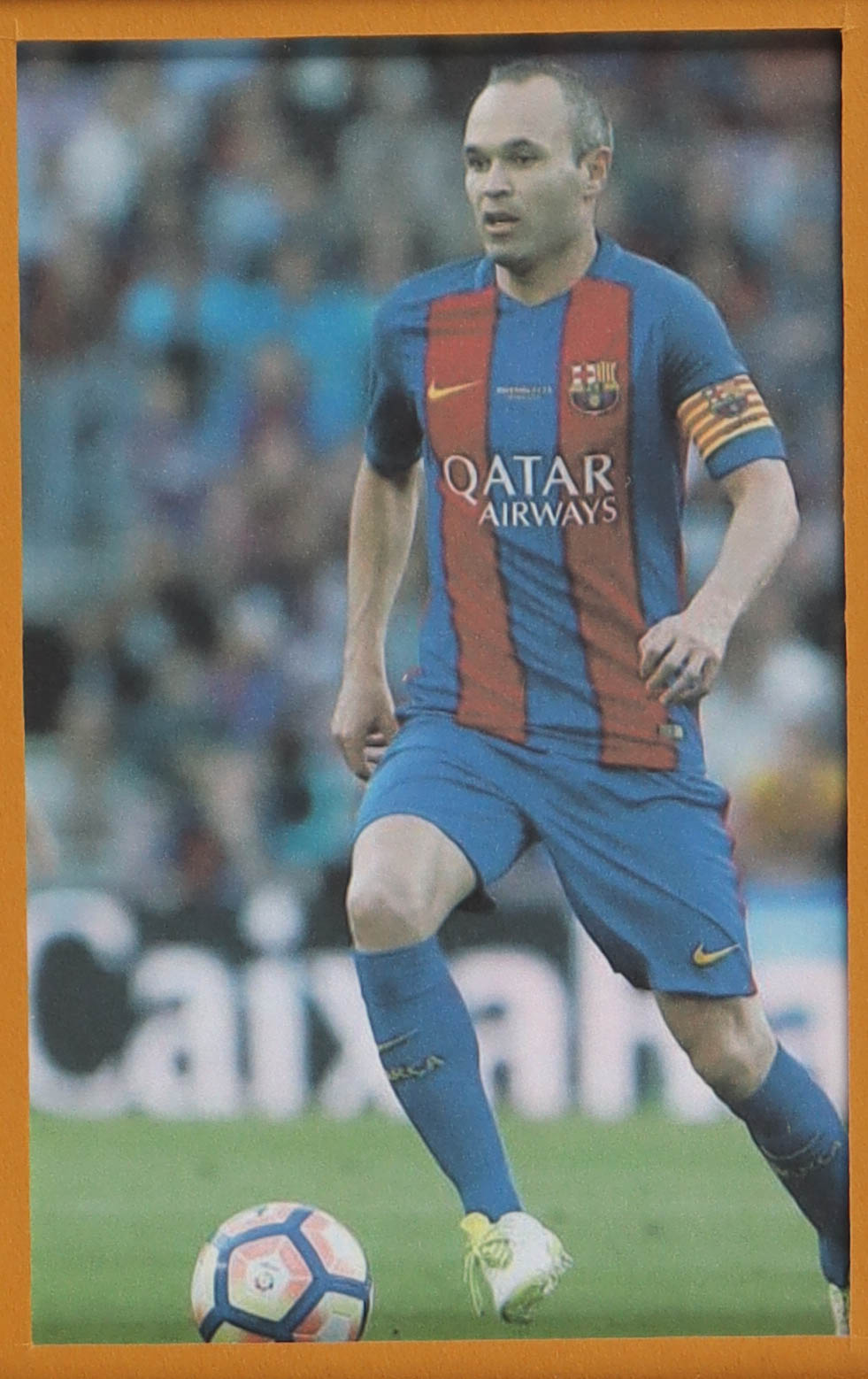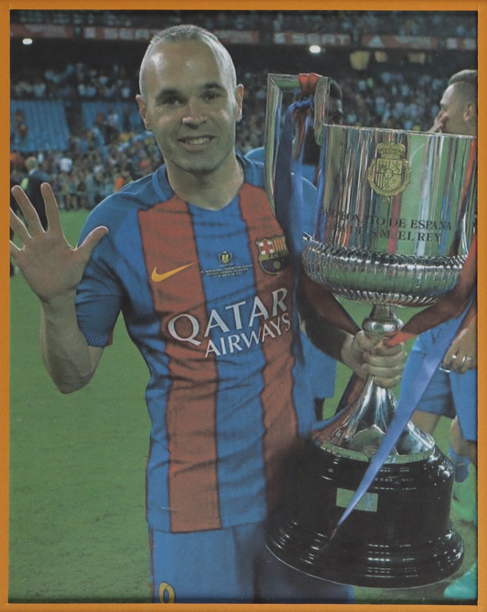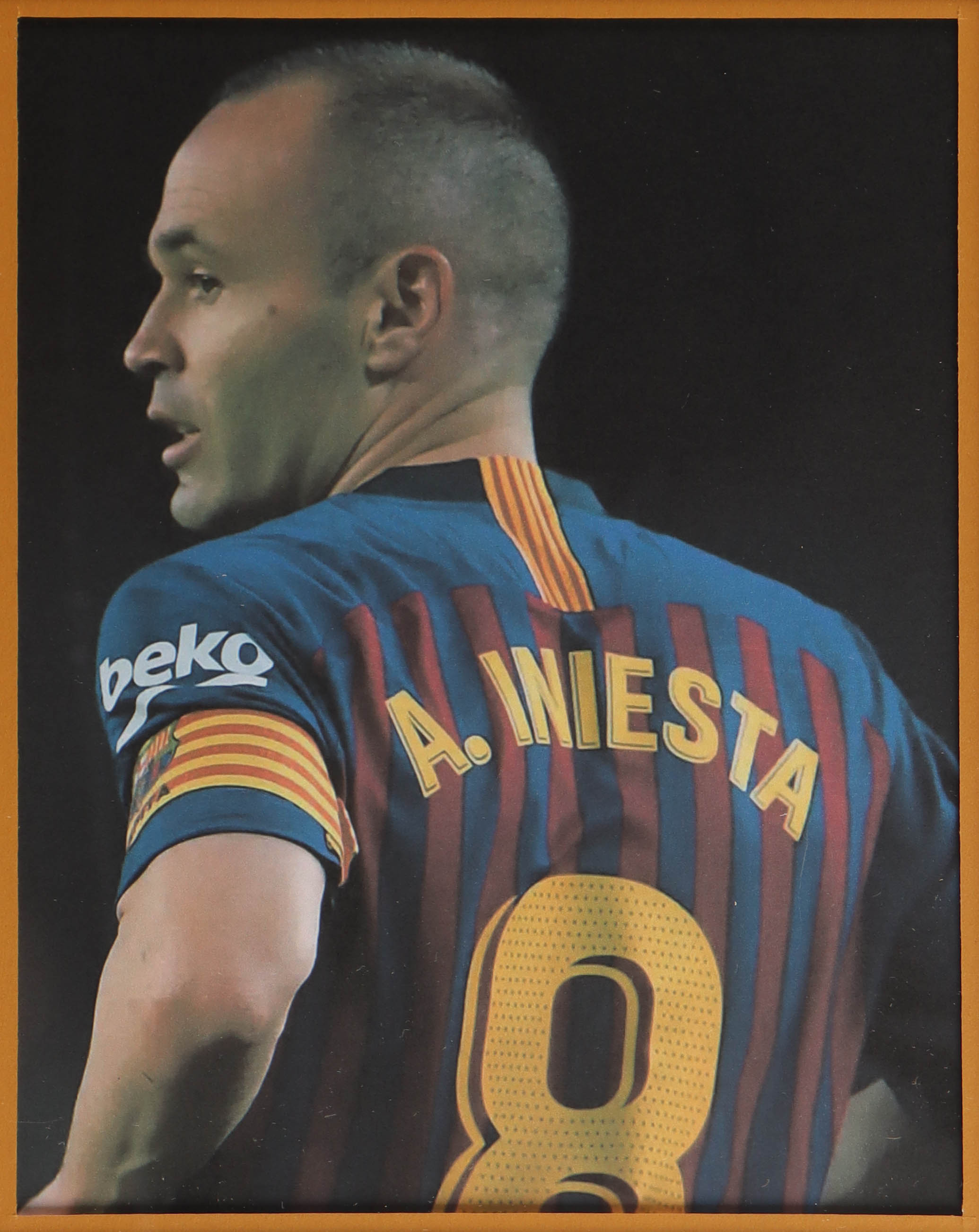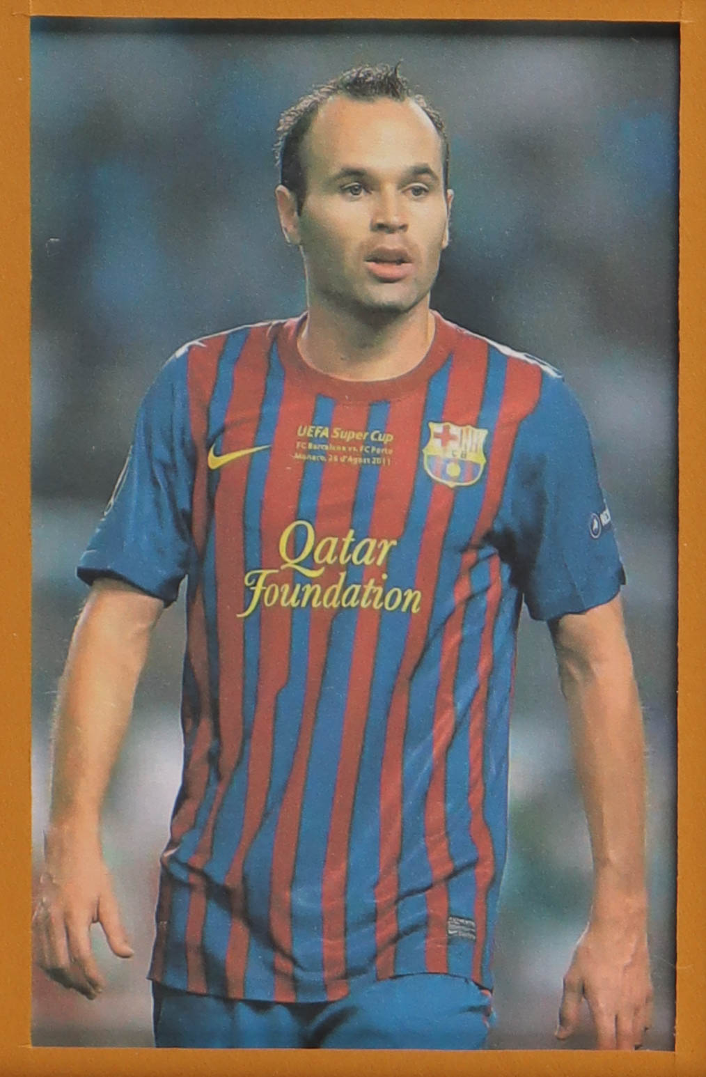 Custom frame measures 34" x 42" in size. Jersey has been hand-signed by Andres Iniesta. Display also includes (4) unsigned 8" x 10" photographs and a team patch.