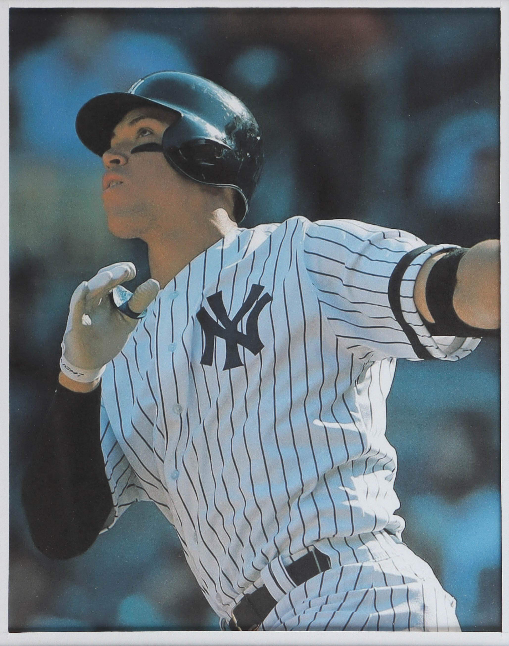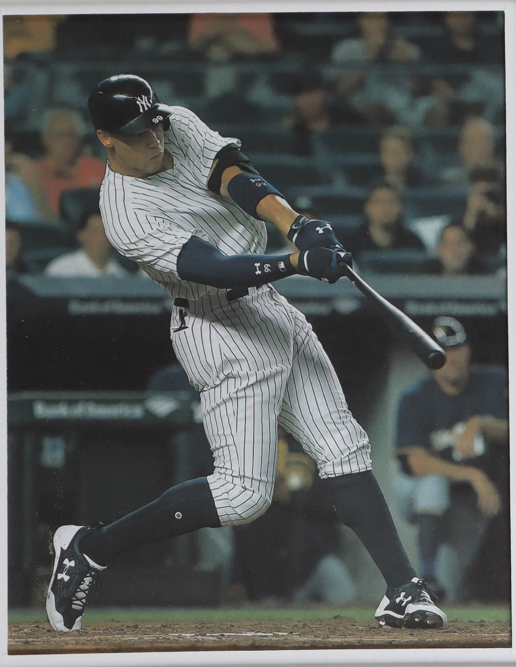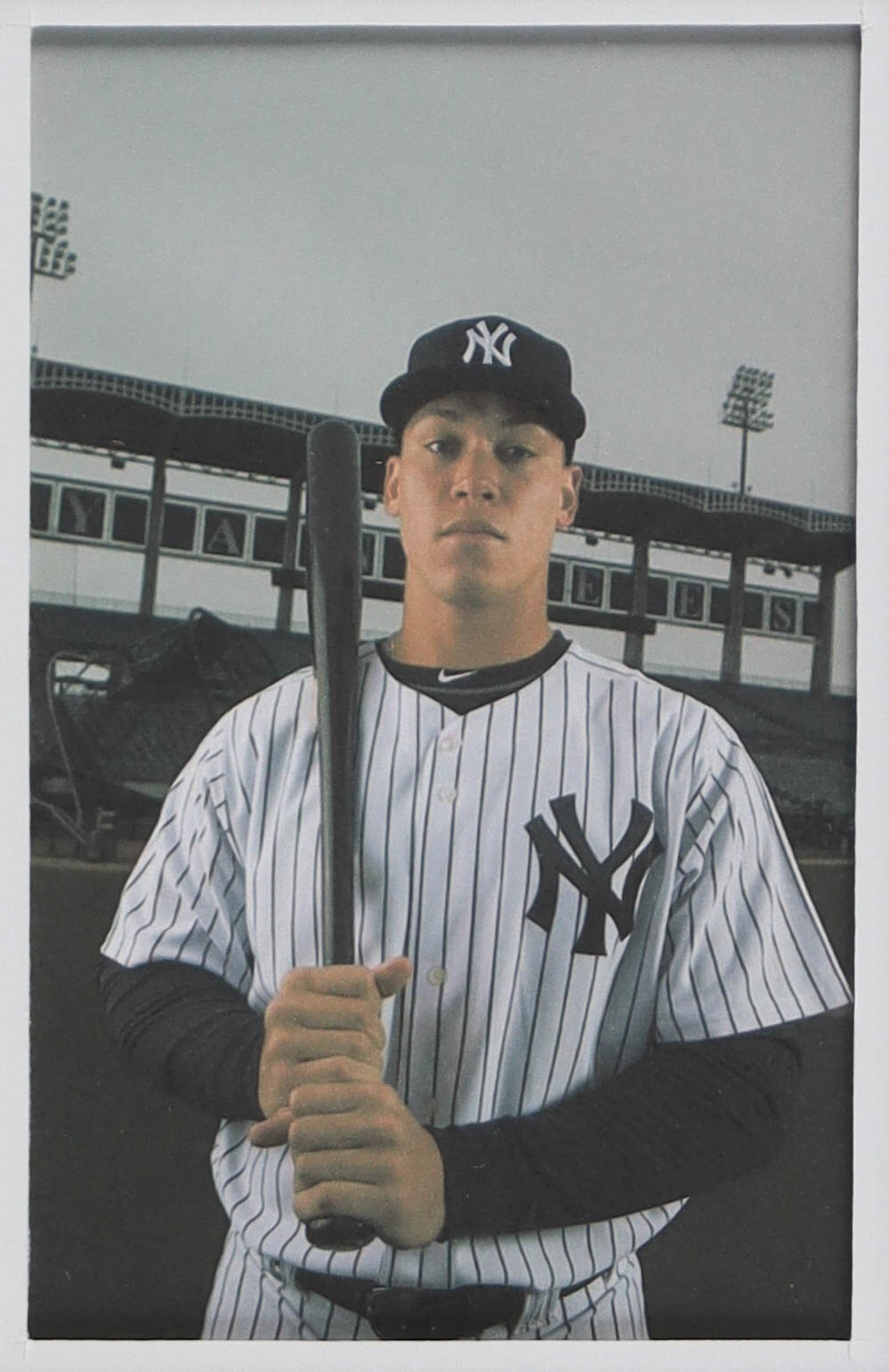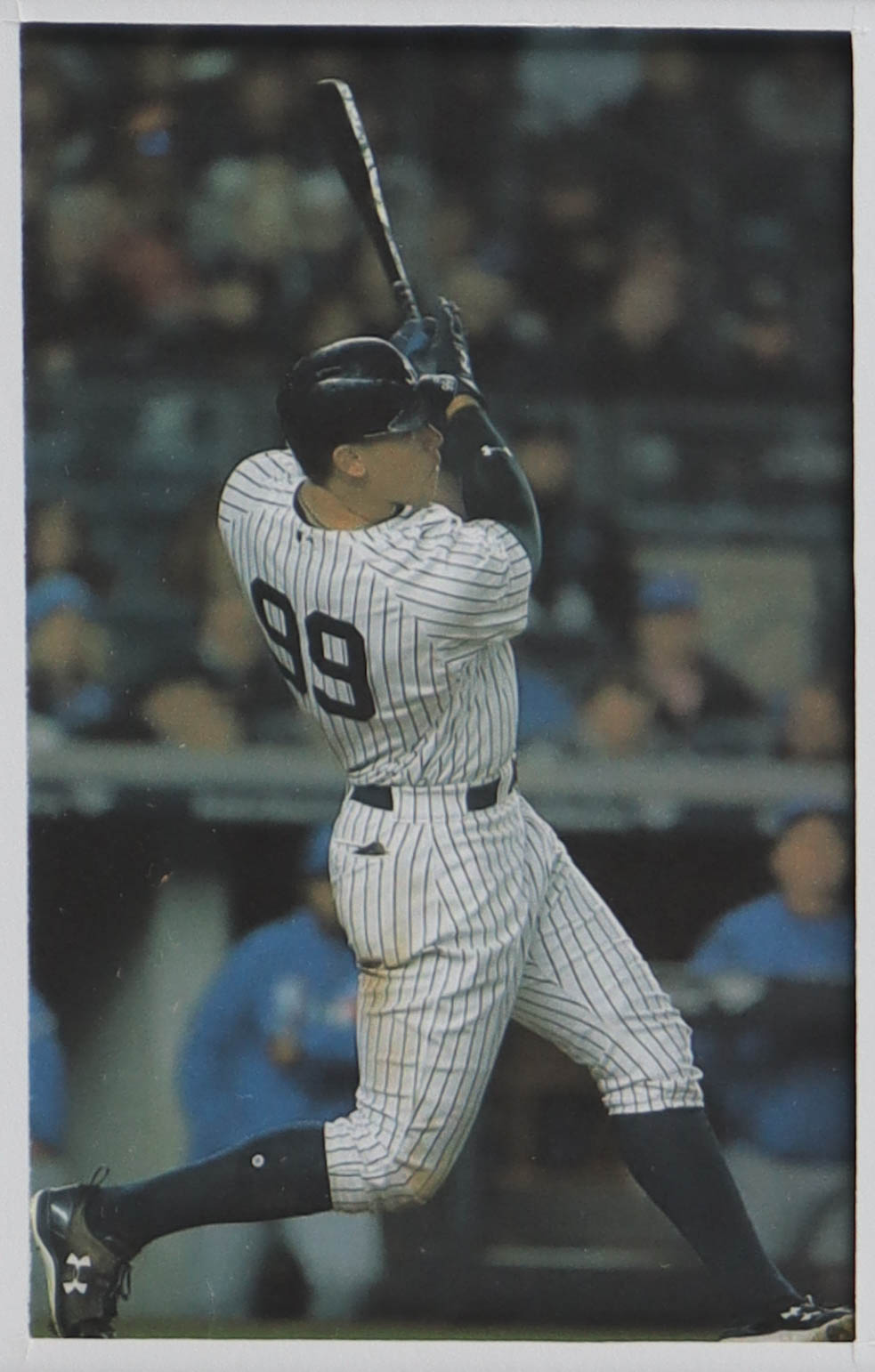Custom frame measures 34" x 42" in size. Jersey has been hand-signed by Aaron Judge (New York Yankees). Display also includes (4) unsigned 8" x 10" photographs and a team patch.