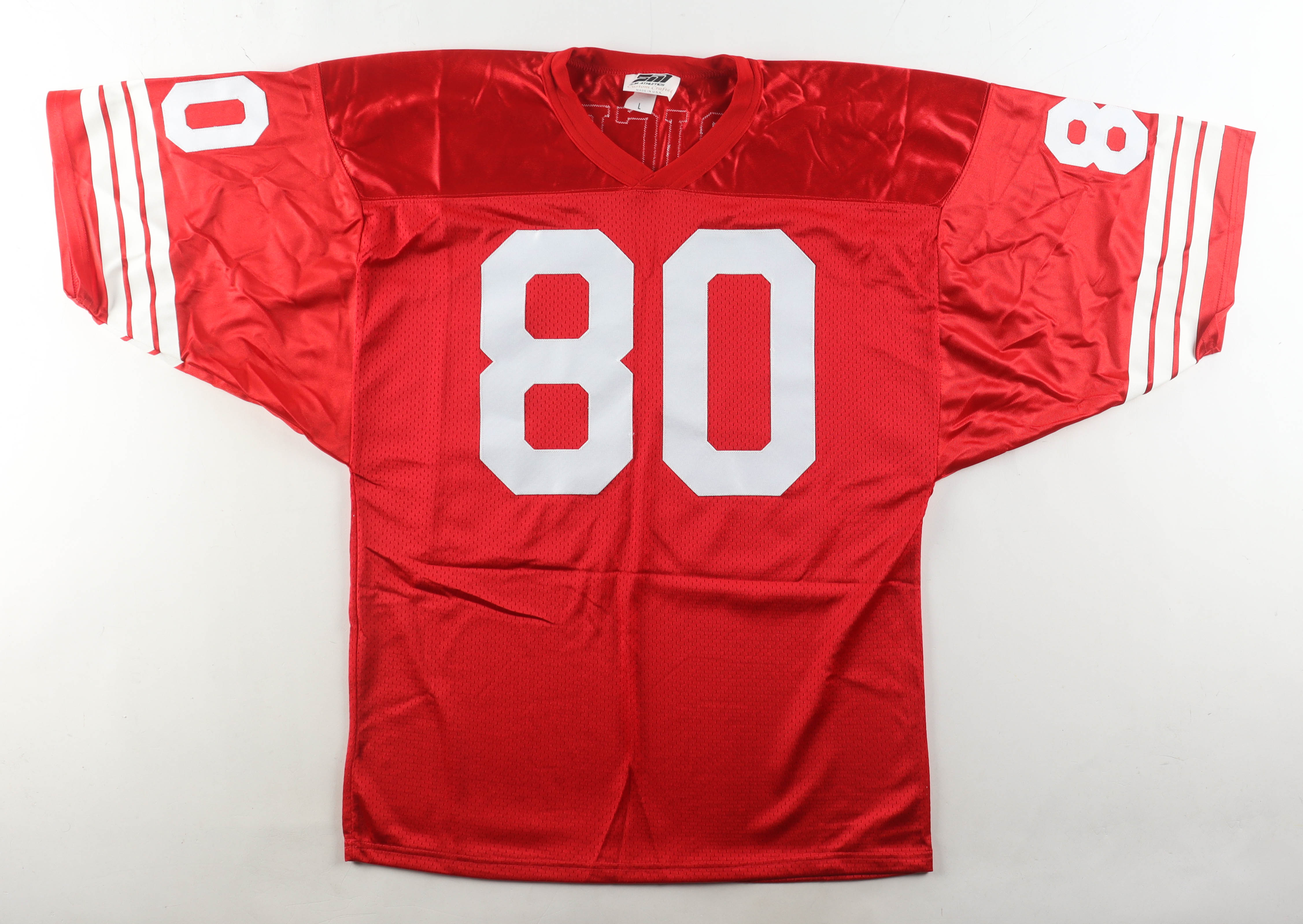 Custom jersey with everything sewn on, size XL. Hand-signed and inscribed by Jerry Rice (HOF).