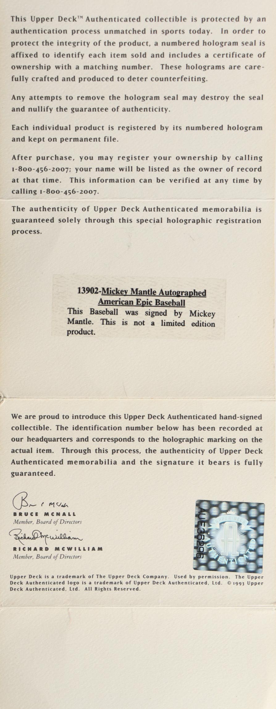 The American Epic baseball. Hand-signed by Mickey Mantle (D. 1995, New York Yankees, HOF).