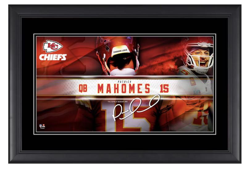 Custom frame measures 10" x 18” in size and features a photo of Patrick Mahomes (Kansa City Chiefs). Please note, this signature is a facsimile and not signed.