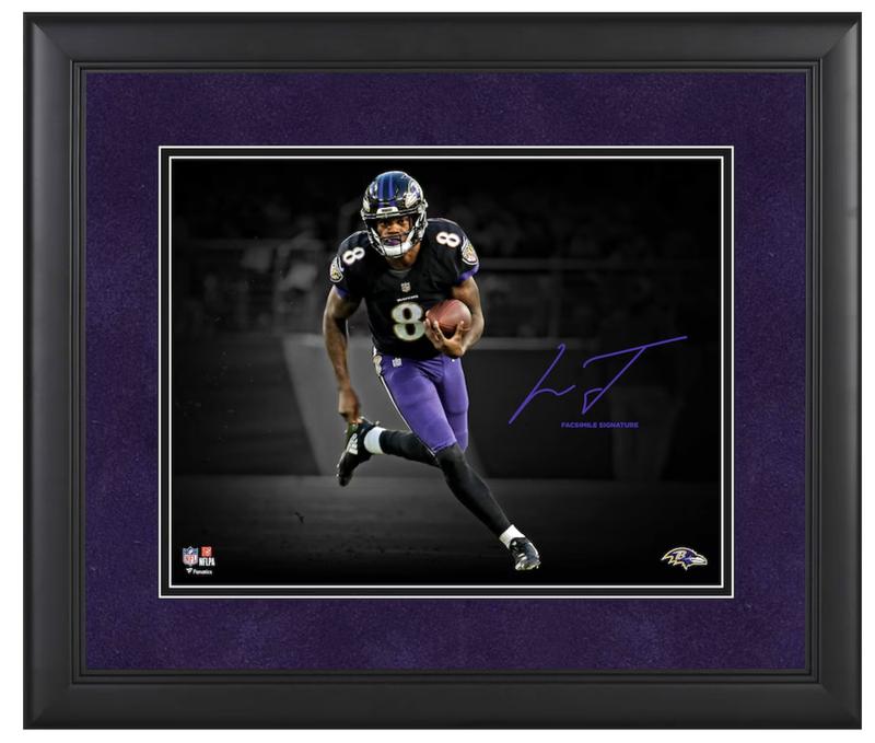 Custom frame measures 11” x 14” in size and features a photo of Lamar Jackson (Baltimore Ravens). Please note, this signature is a facsimile and not signed.