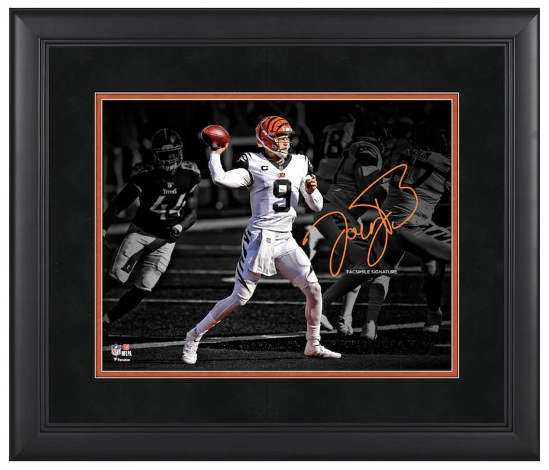 Custom frame measures 11” x 14” in size and features a photo of Joe Burrow (Cincinnati Bengals). Please note, this signature is a facsimile and not signed.