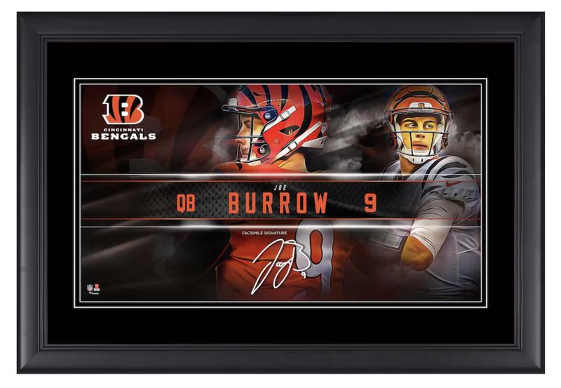 Custom frame measures 10" x 18” in size and features a photo of Joe Burrow (Cincinnati Bengals). Please note, this signature is a facsimile and not signed.
