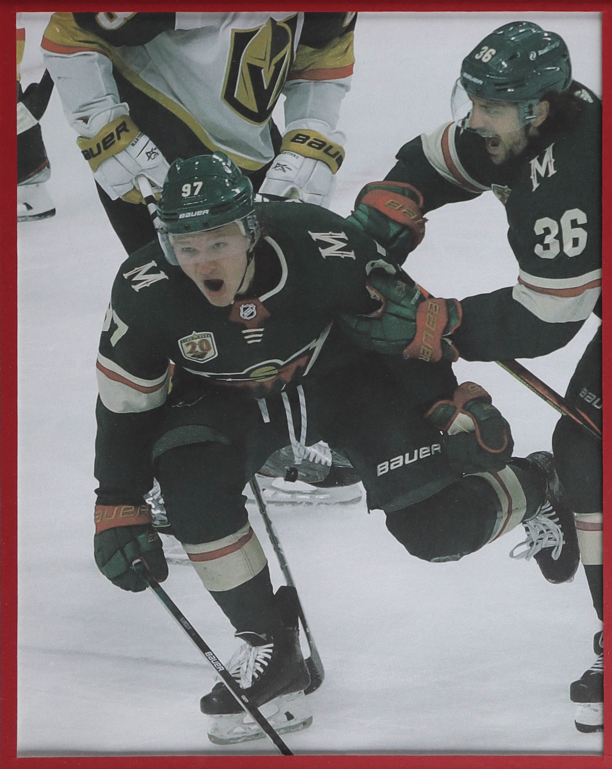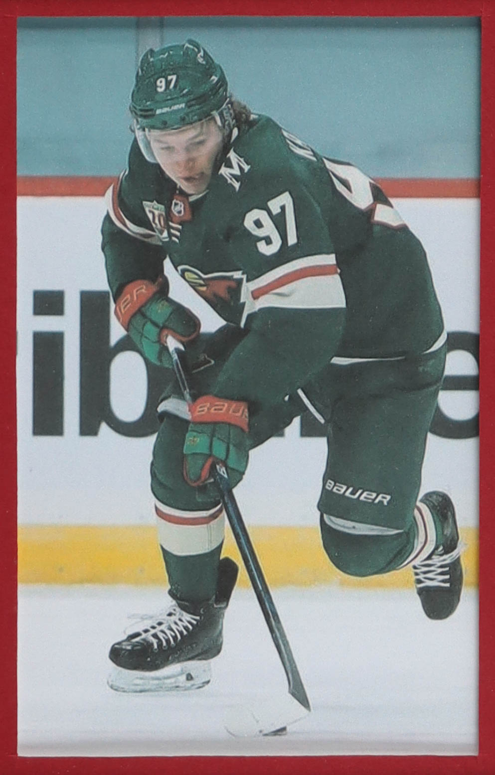 Custom frame measures 34" x 42" in size. Jersey has been hand-signed by Kirill Kaprizov (Minnesota Wild). Display also includes (4) unsigned photographs and a team logo patch.