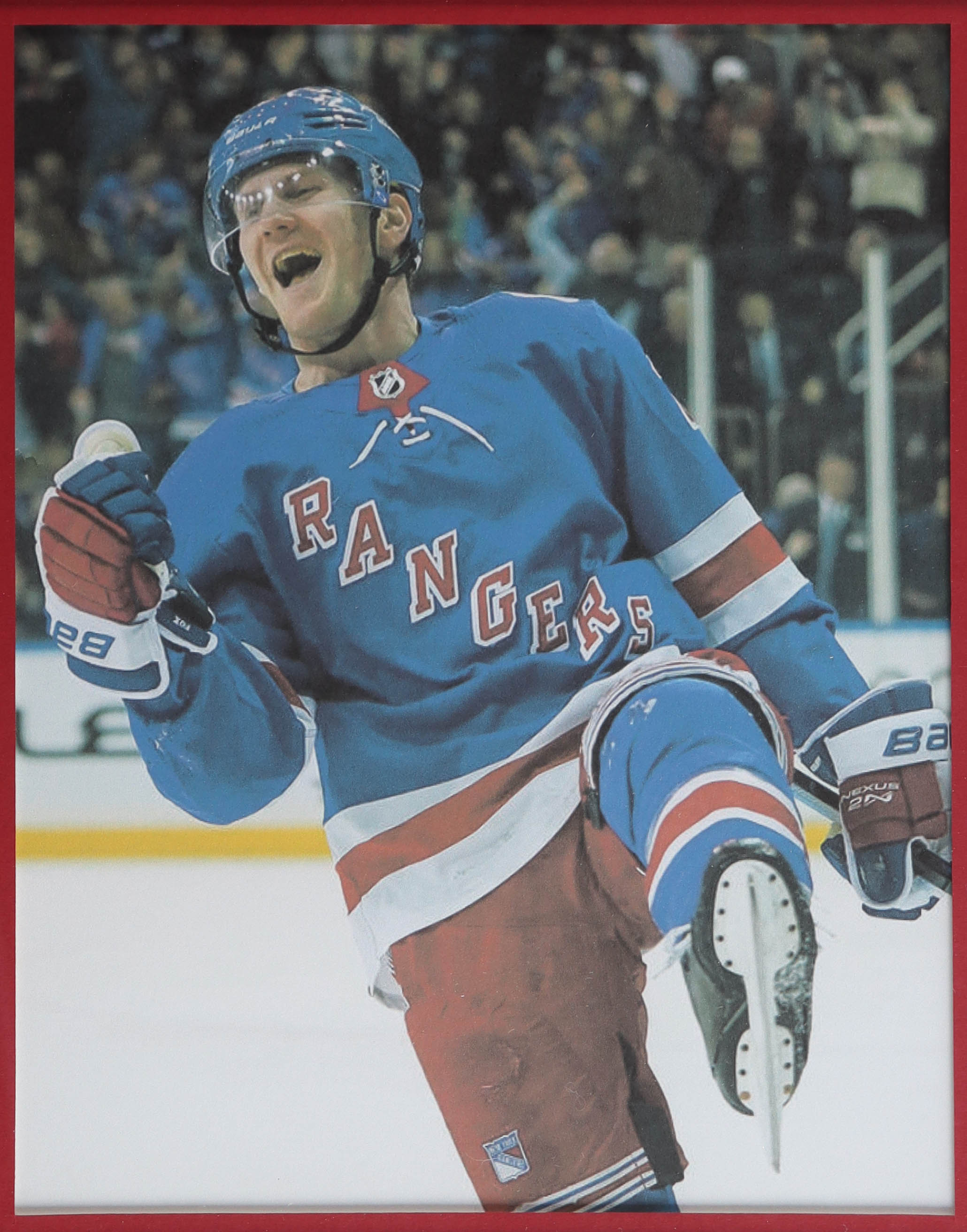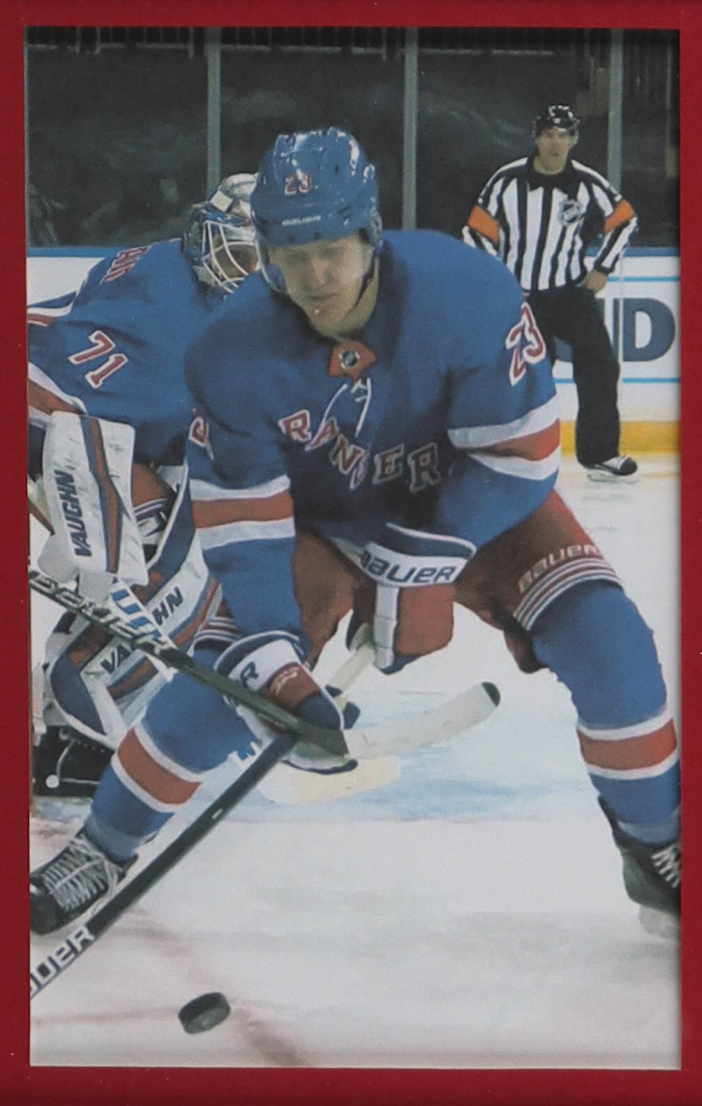 Custom frame measures 34" x 42" in size. Jersey has been hand-signed by Adam Fox (New York Rangers). Display also includes (4) unsigned photographs and a team logo patch.