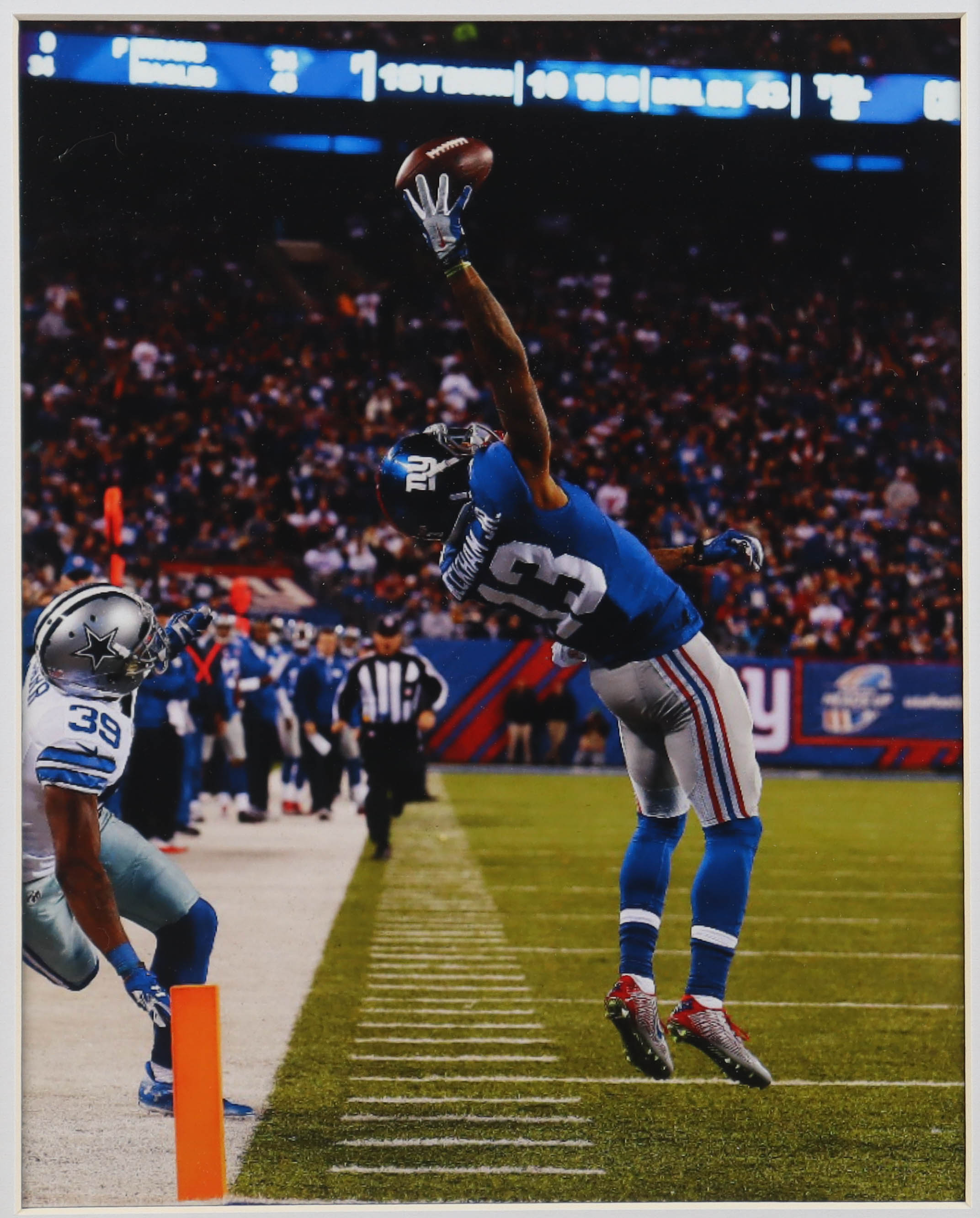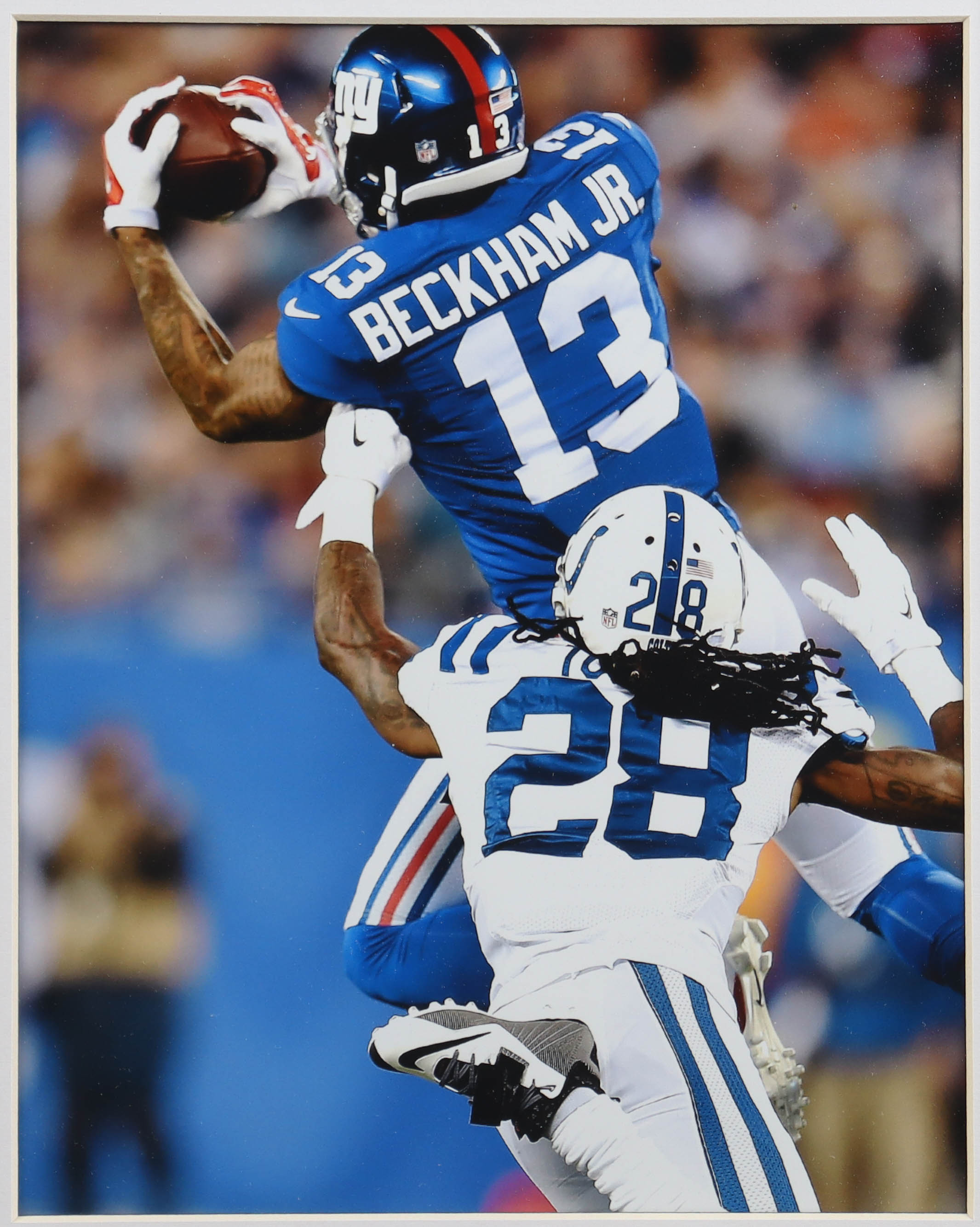 Custom frame measures 36" x 43.5" in size and features a jersey that has been hand-signed by Odell Beckham Jr. Note that the 8" x 10" photos may be in reverse order. Please note that the jersey shows a slight stain above the #3.