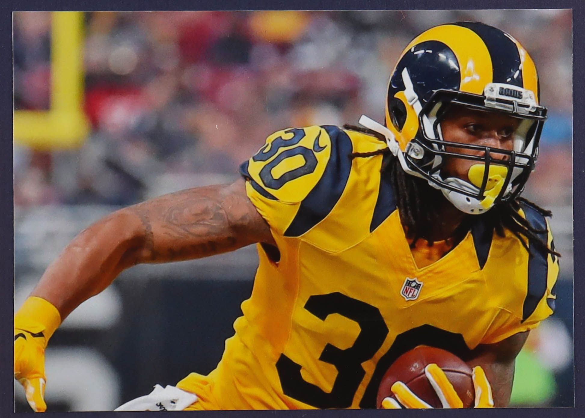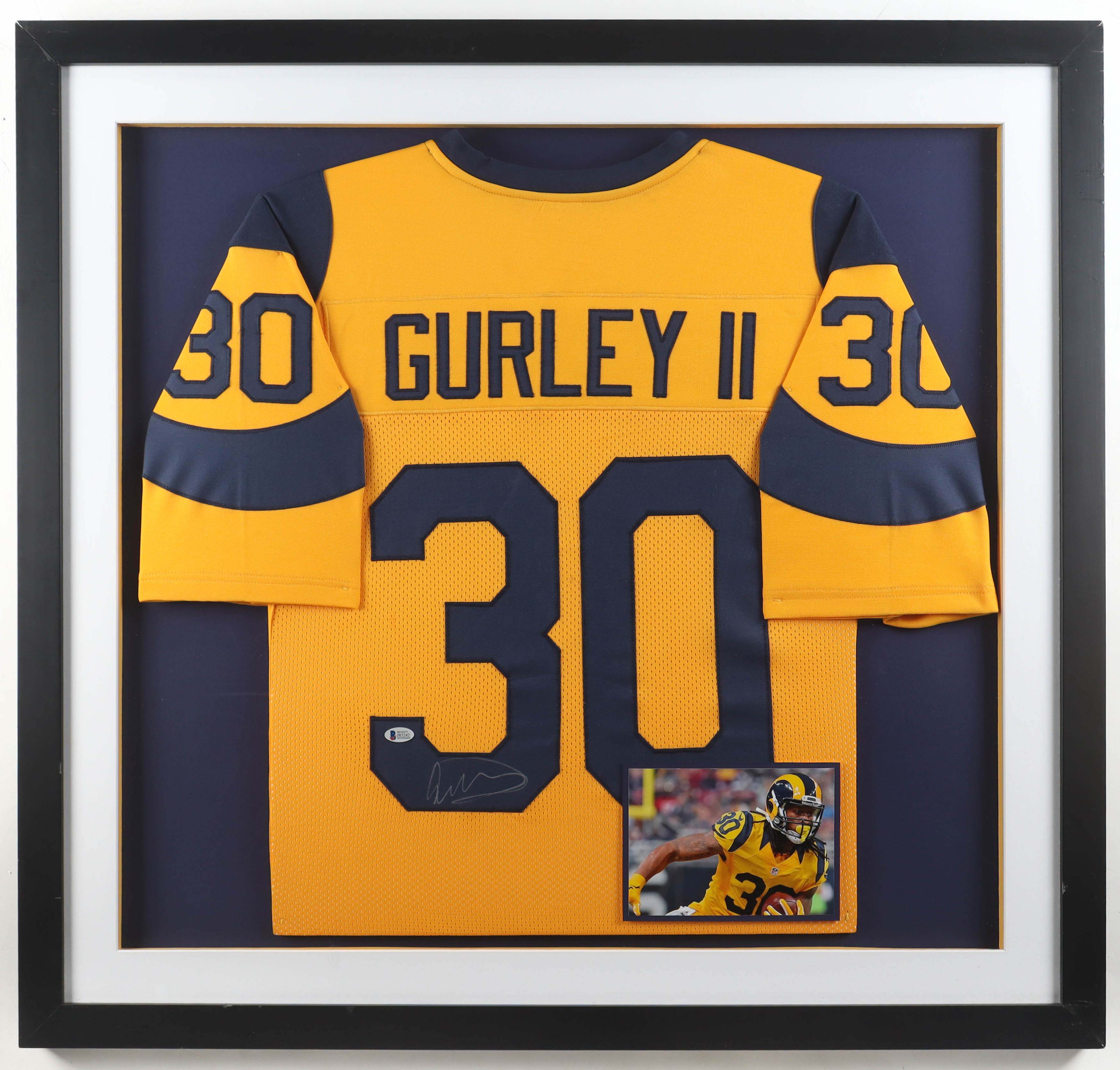 Custom frame measures 36" x 43.5" in size and features a jersey that has been hand-signed by Todd Gurley II. Please note that the frame shows signs of damage.