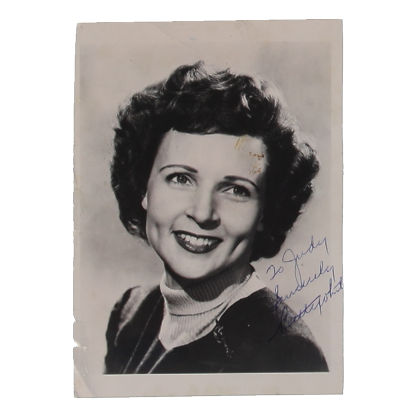 Photo measures approximately 3.75" x 5" in size and has been hand-signed and inscribed by Betty White (D. 2021). Please note, the inscription has been personalized "To Judy".
