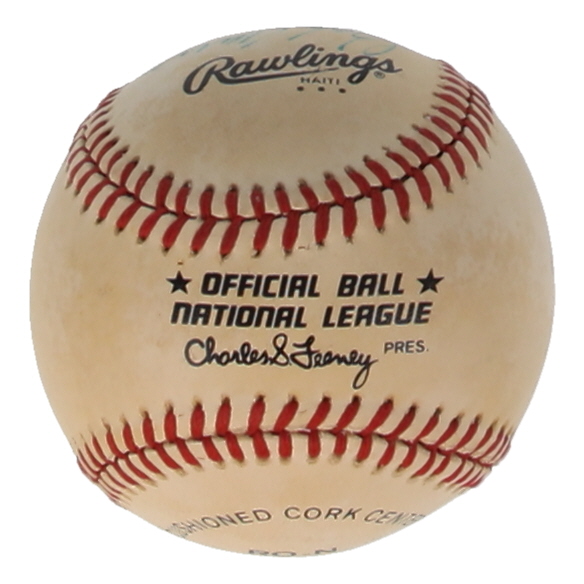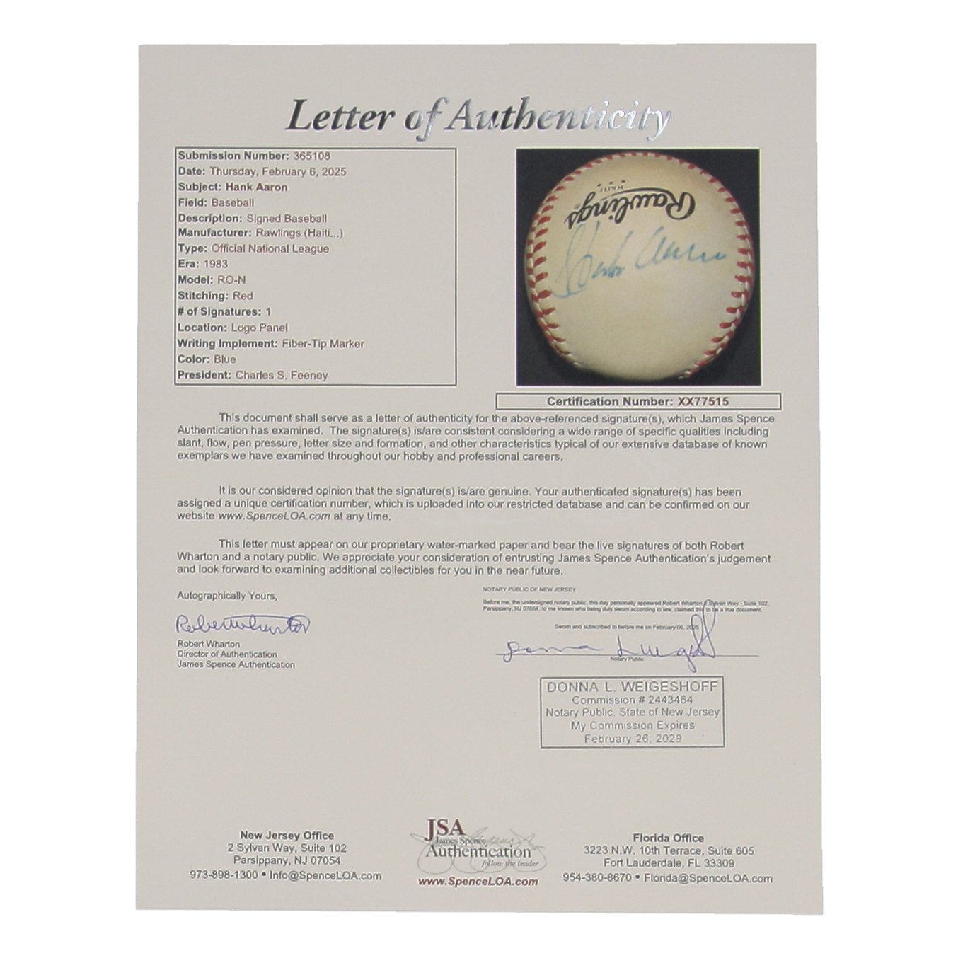 Rawlings Official National League baseball. Hand-signed by Hank Aaron (D. 2021, Atlanta Braves, HOF).