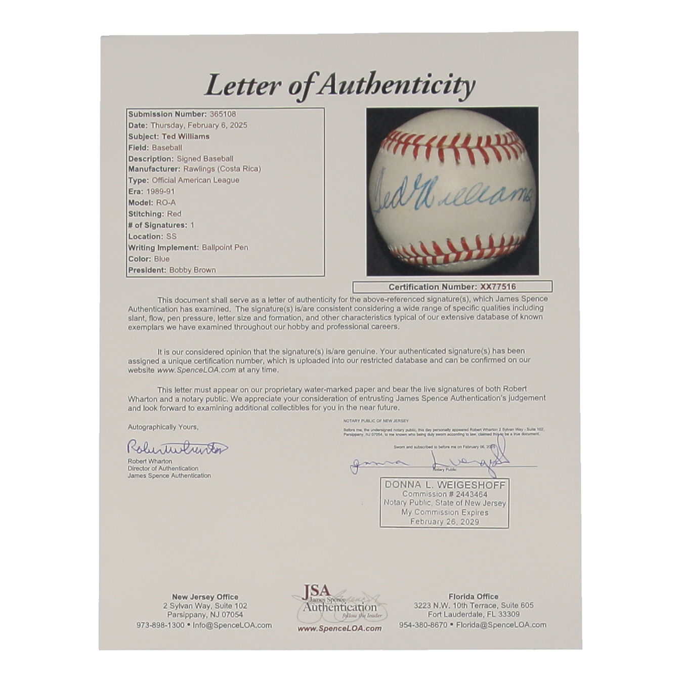 Rawlings Official American League baseball has been hand-signed by Ted Williams (D. 2002, Boston Red Sox, HOF).