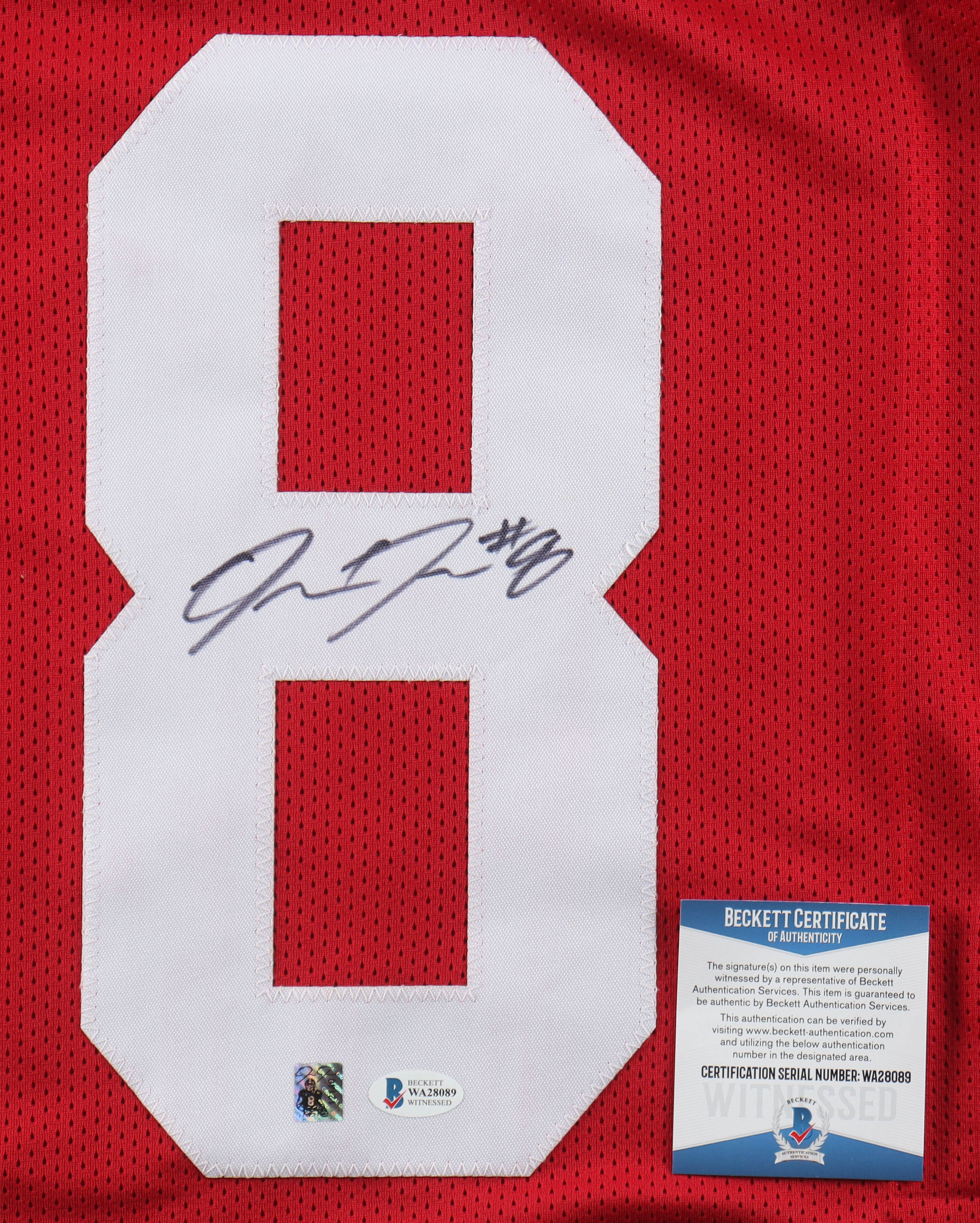 The autograph includes an official Beckett Authentication Services serially-numbered hologram and matching COA as well as an official Josh Jacobs Pro Player hologram for authenticity purposes. The signing of this item was witnessed by Beckett.